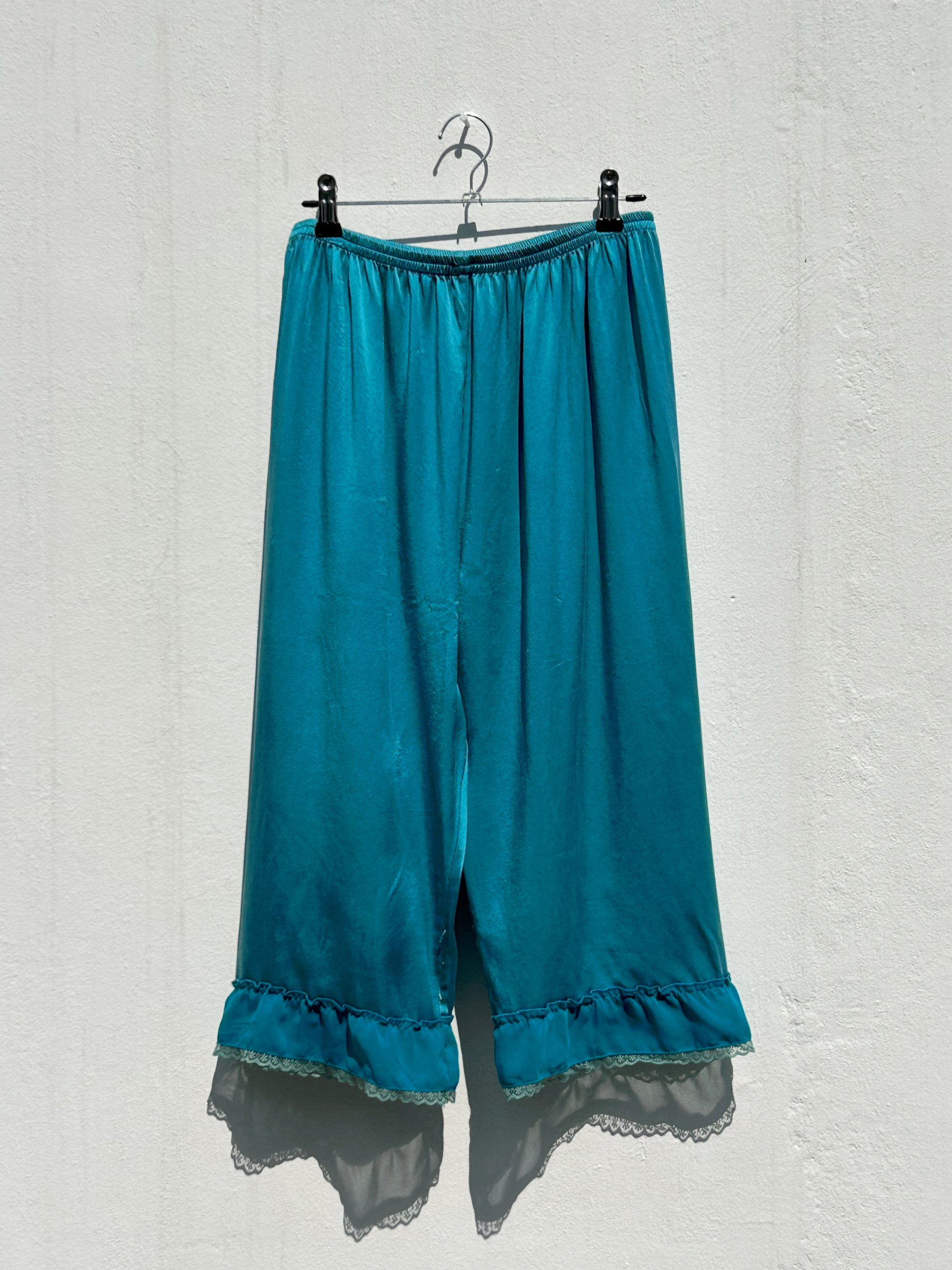 Coquetos pantalones pescadores de Charmeuse seda, pierna ancha y cómoda, elástico en cintura, con aplicación de encaje en el ruedo, tiene pequeños signos de uso, largo midi, dicen talla extra grande pero son mas reducidos.