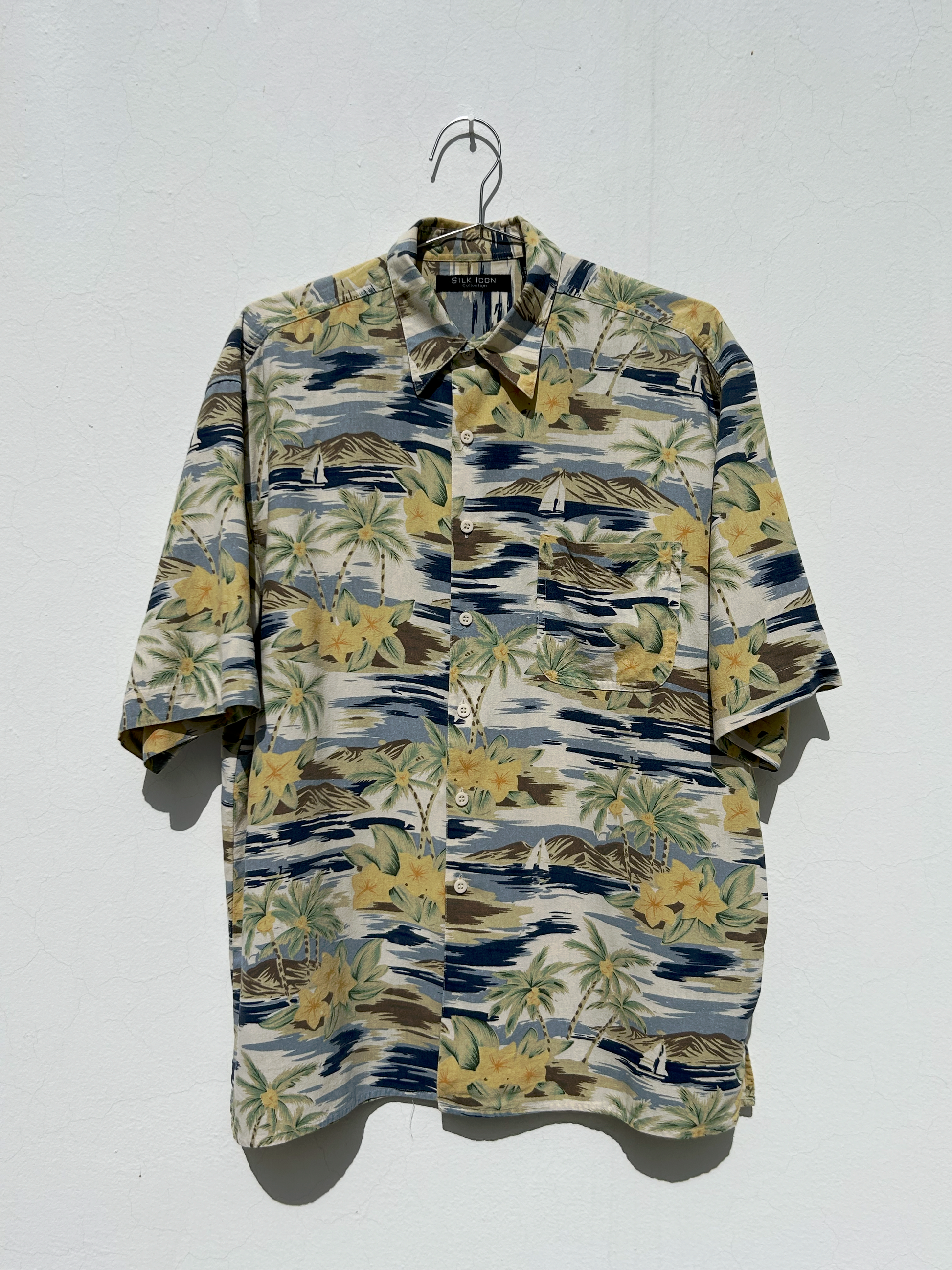 Coqueta camisa de seda, estampado de paisaje tropical, con montañas y palmeras en tonos muy armoniosos amarillo maíz, verde musgo, azul indigo y marfil, mini aberturas a los costados, bolsillo redondo al frente.