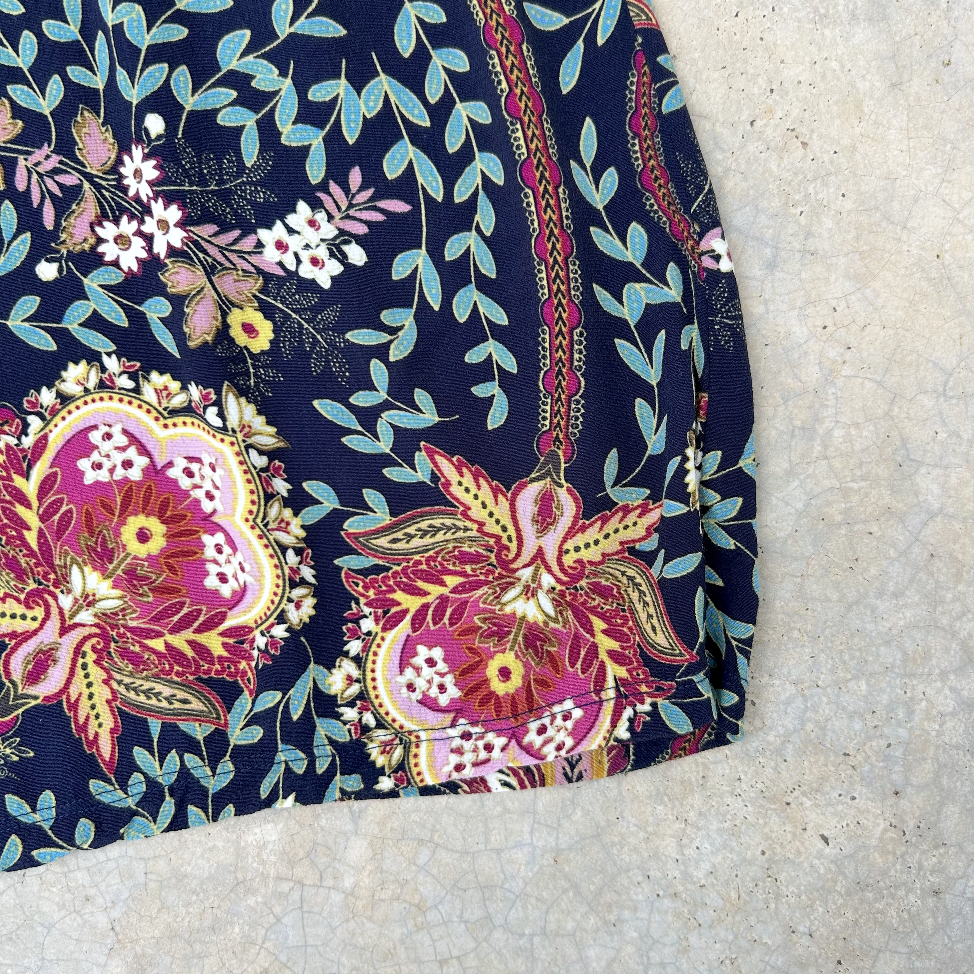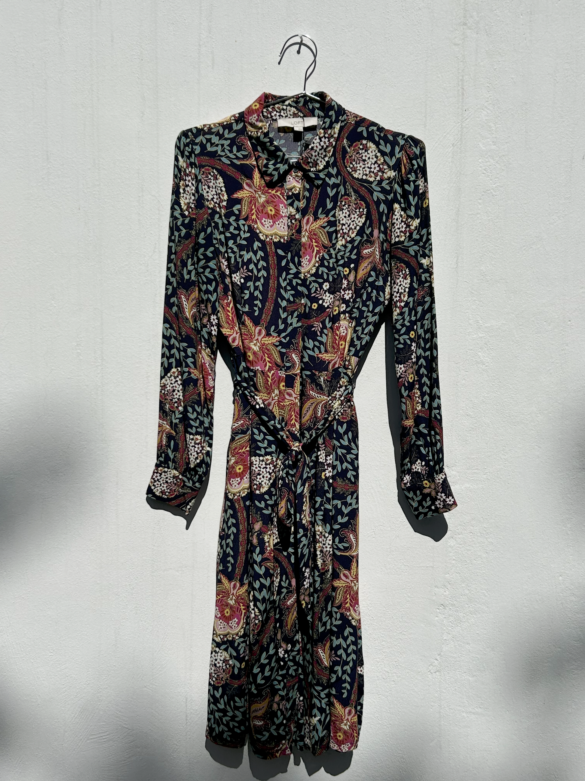 Precioso vestido camisero de viscosa, estampado de Paisley’s, flores, hojas en tonos blanco, rosa mexicano, rosa pastel, azul acero, sobre fondo color azul marino, silueta de la falda es media campana con paletones entallando la cintura, botones escondidos, trae cinta cinturón de la misma tela, bolsillos escondidos laterales, como nuevo!