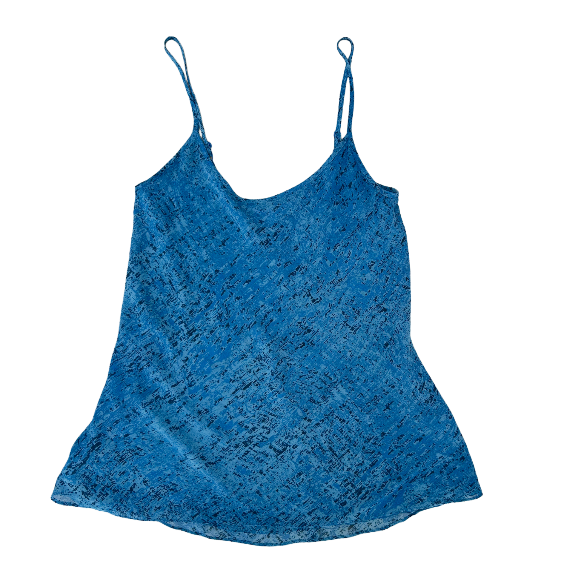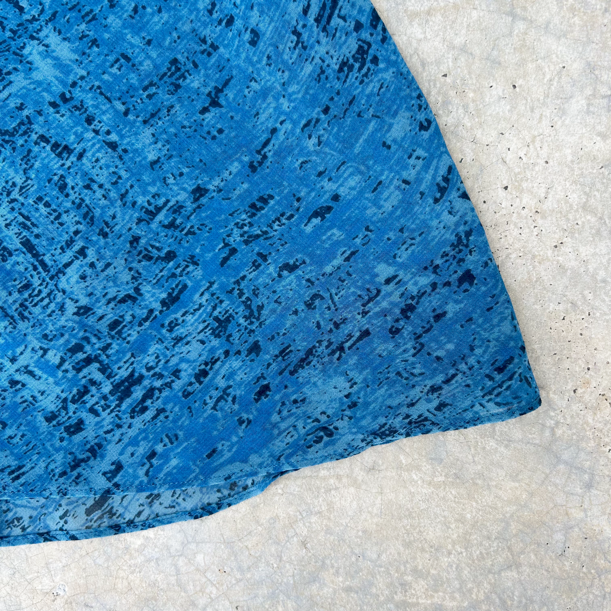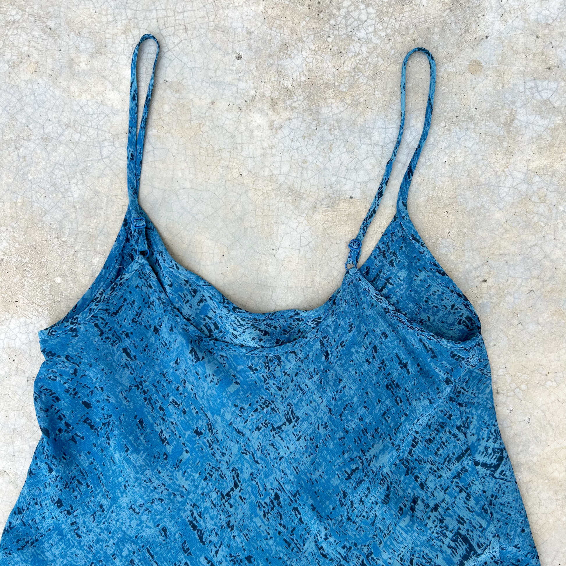 Coqueto vestido de poliéster, forrado de la misma tela, hermoso estampado abstracto con una combinación de azules en tono acero, indigo y negro, tirantes de espagueti ajustables, corte al bies lo que le da mucho movimiento, es cortito.