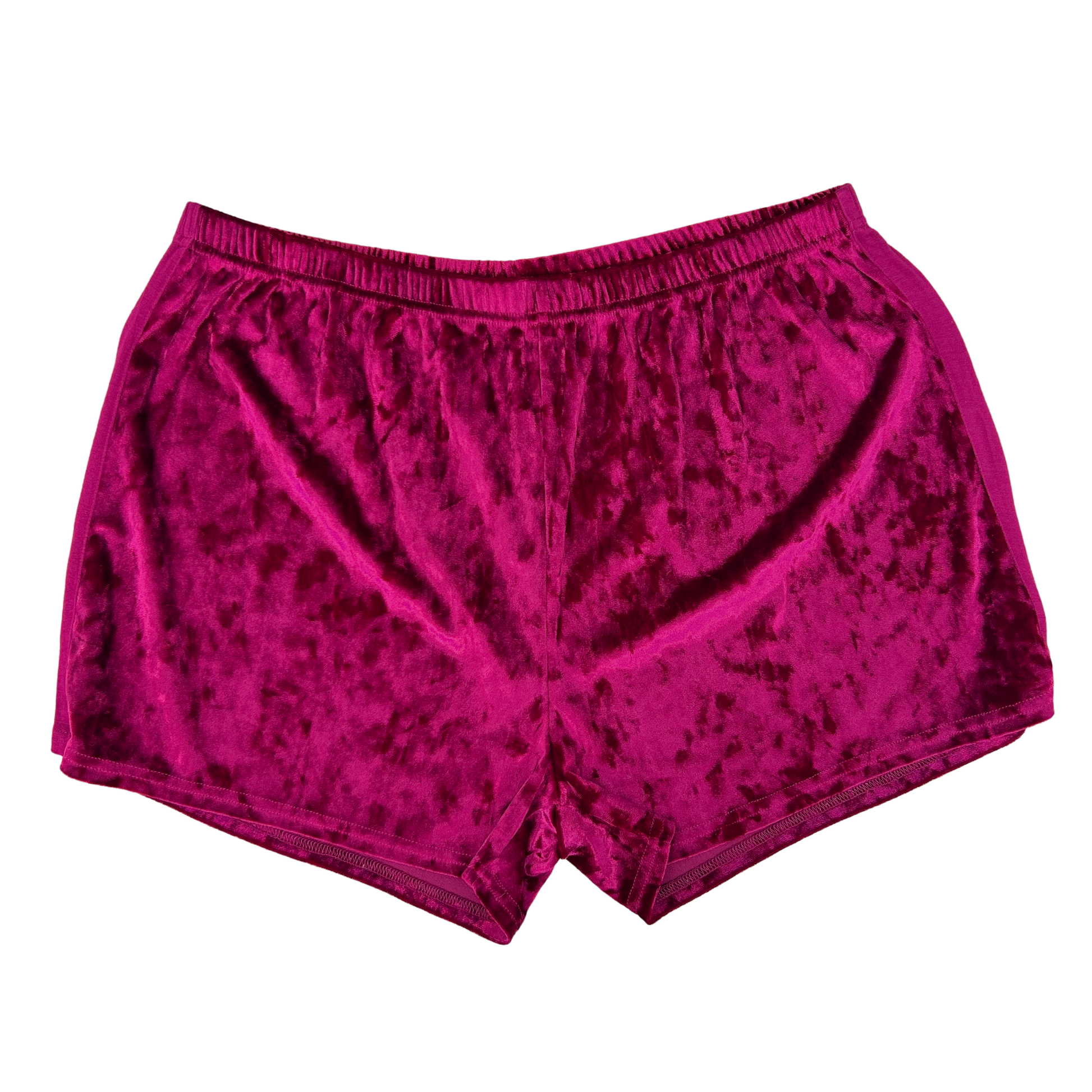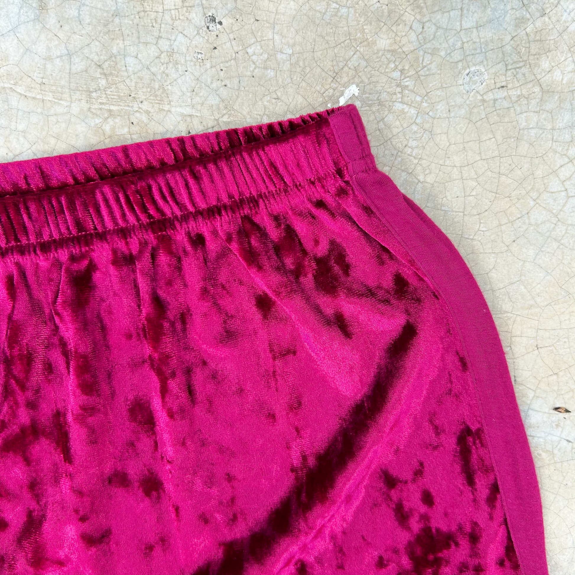 Coquetos shorts de terciopelo rayon mezcla con spandex, elástico en cintura con una franja lateral de distinta textura, hermoso color fucsia oscuro, un poco tornasol por ser terciopelo, super cómodos y no muy cortos.