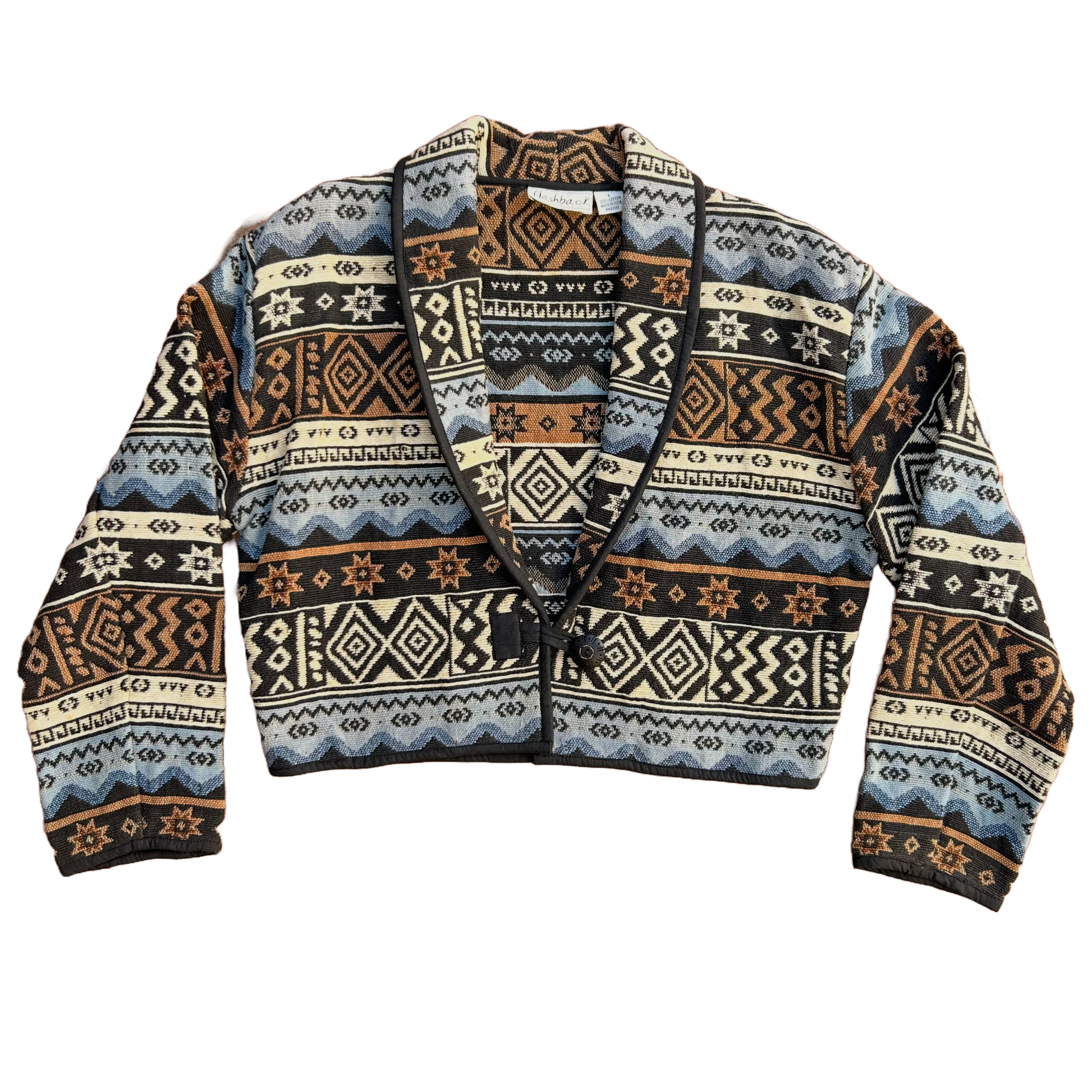 Hermosísima chamarrita corta de algodón, la textura es como de tapete pero mas suave, tiene cuerpo, cuello convertible, divino estampado con inspiración en tribales Nativos Americanos en colores caramelo, celeste cielo, marfil con fondo negro, bies en todo el contorno, botón chino al frente.