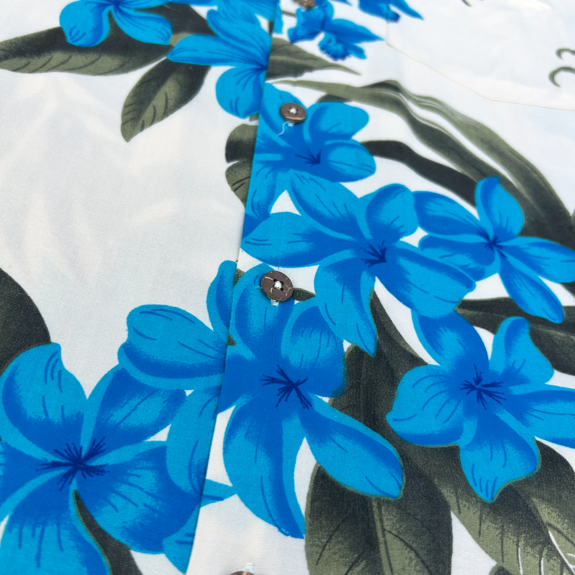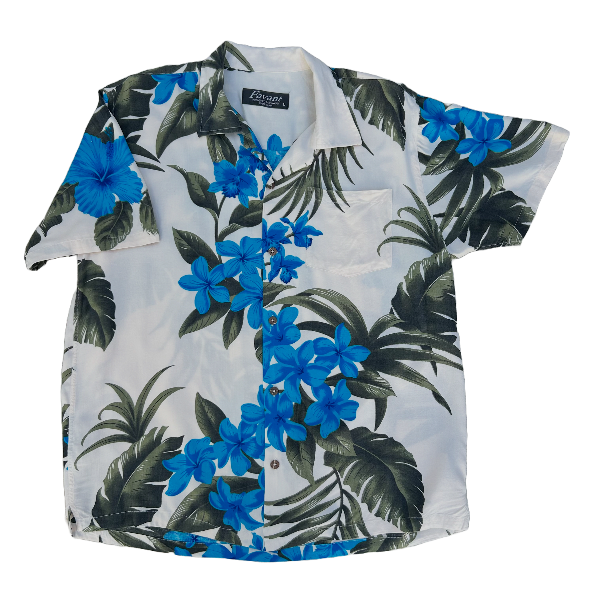 Coqueta camisa de rayón, estampado de flores azul Azur y Cobalto, hojas de palmera en verde botella, fondo azul marfil, bolsillo puntiagudo al frente, botones de coco, muy linda caída, corre un poco chica.