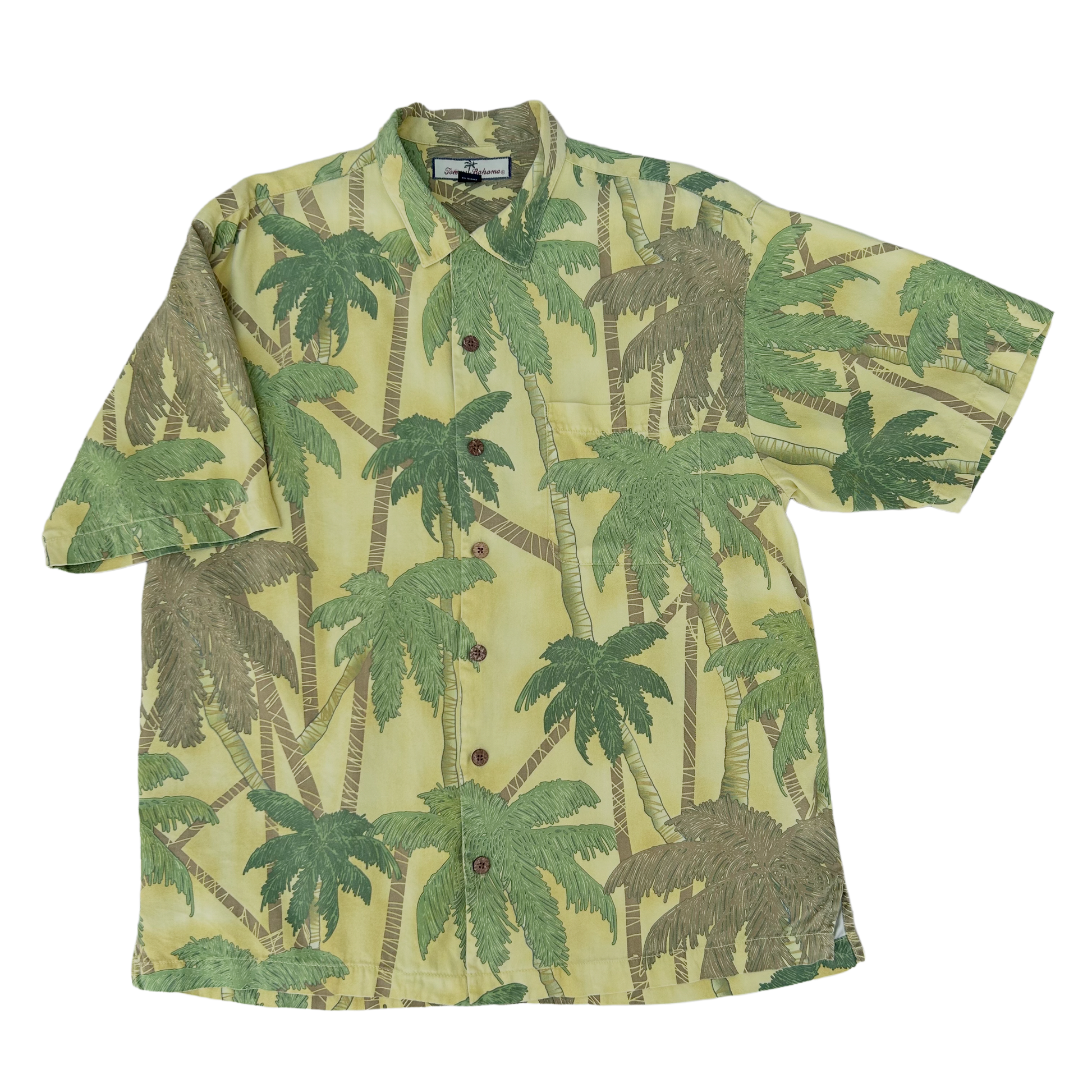 Preciosa camisa de seda, fondo color amarillo verdoso difuminado estampado de palmeras en tonos verde albahaca, cocodrilo y unas cafe, bolsillo redondo al frente, botones de coco.