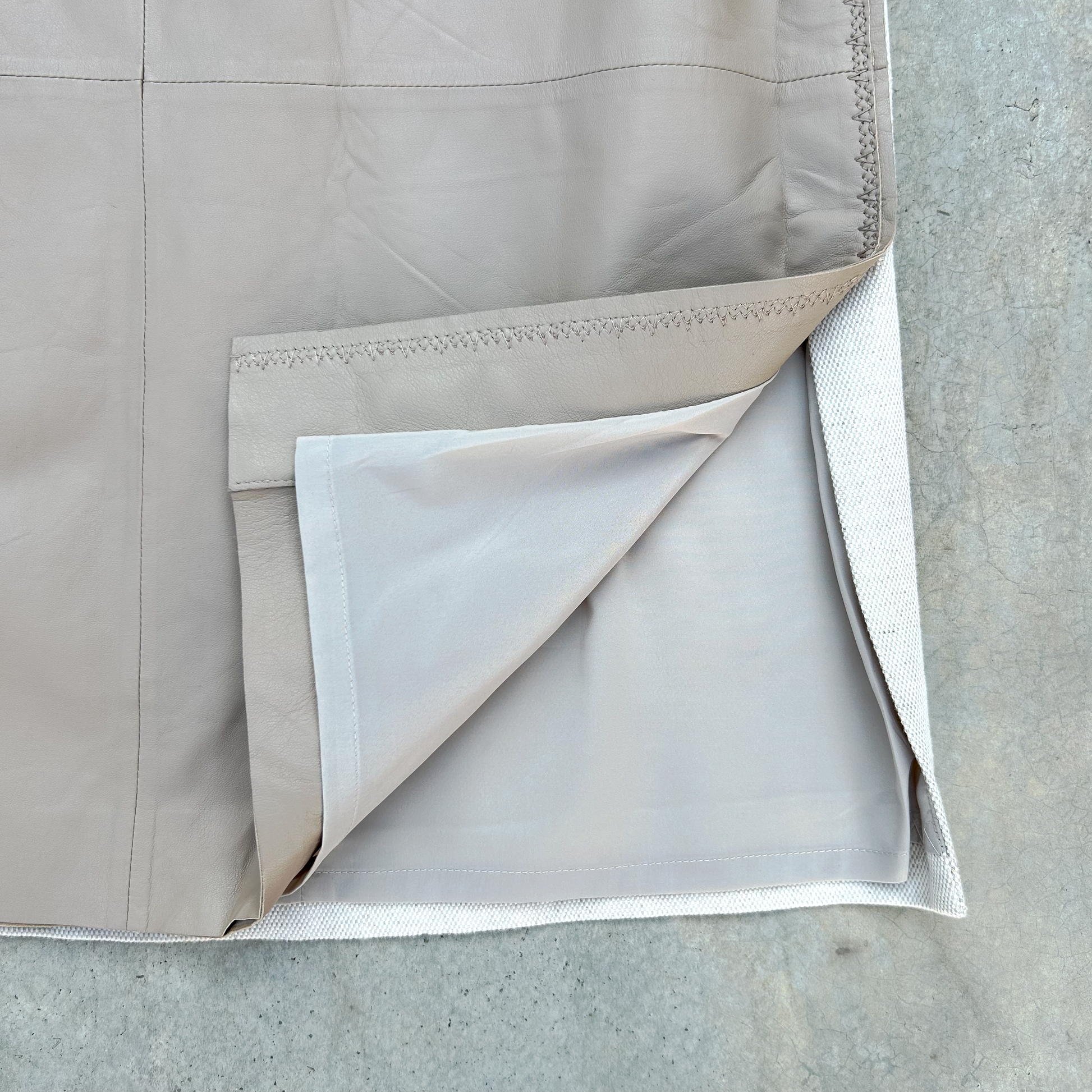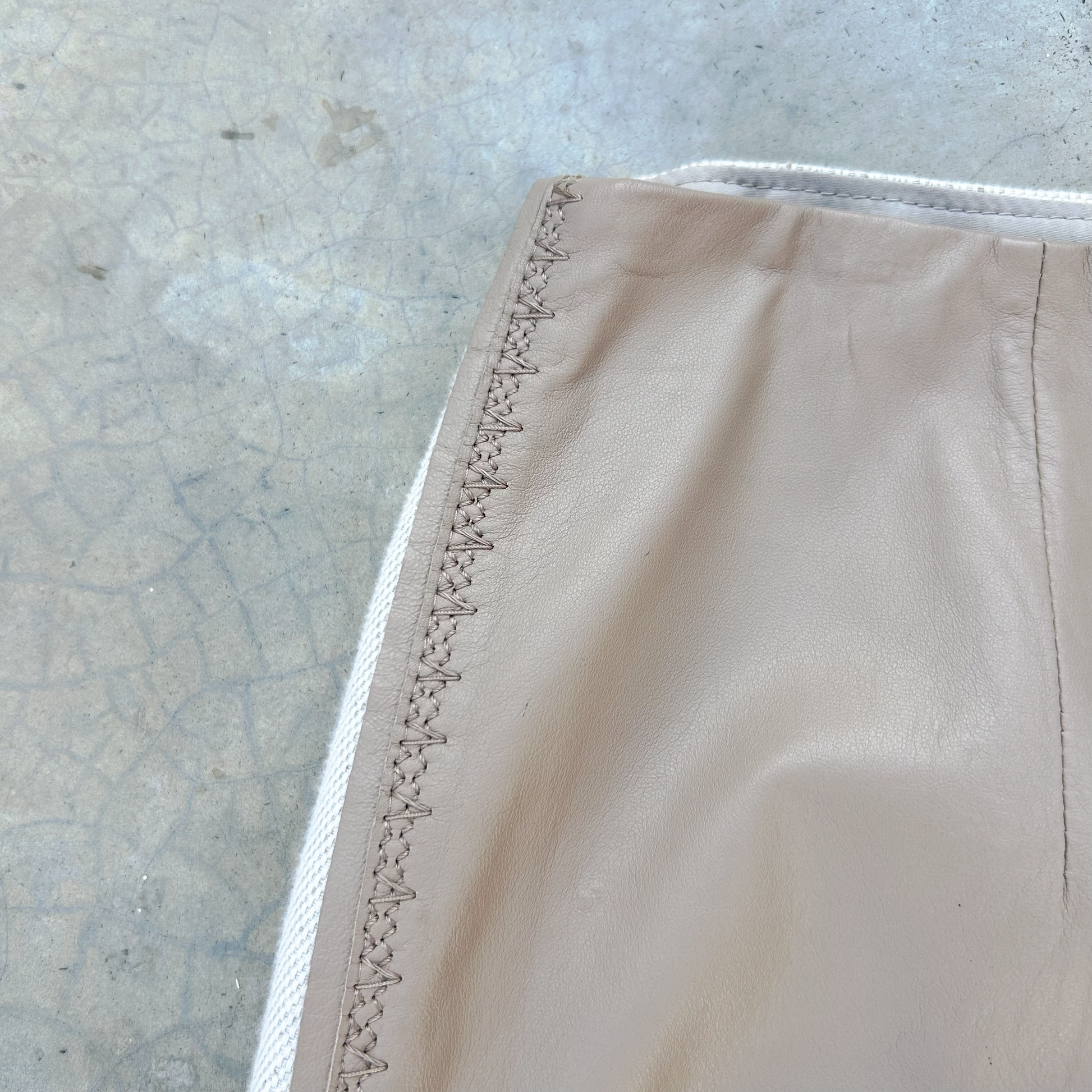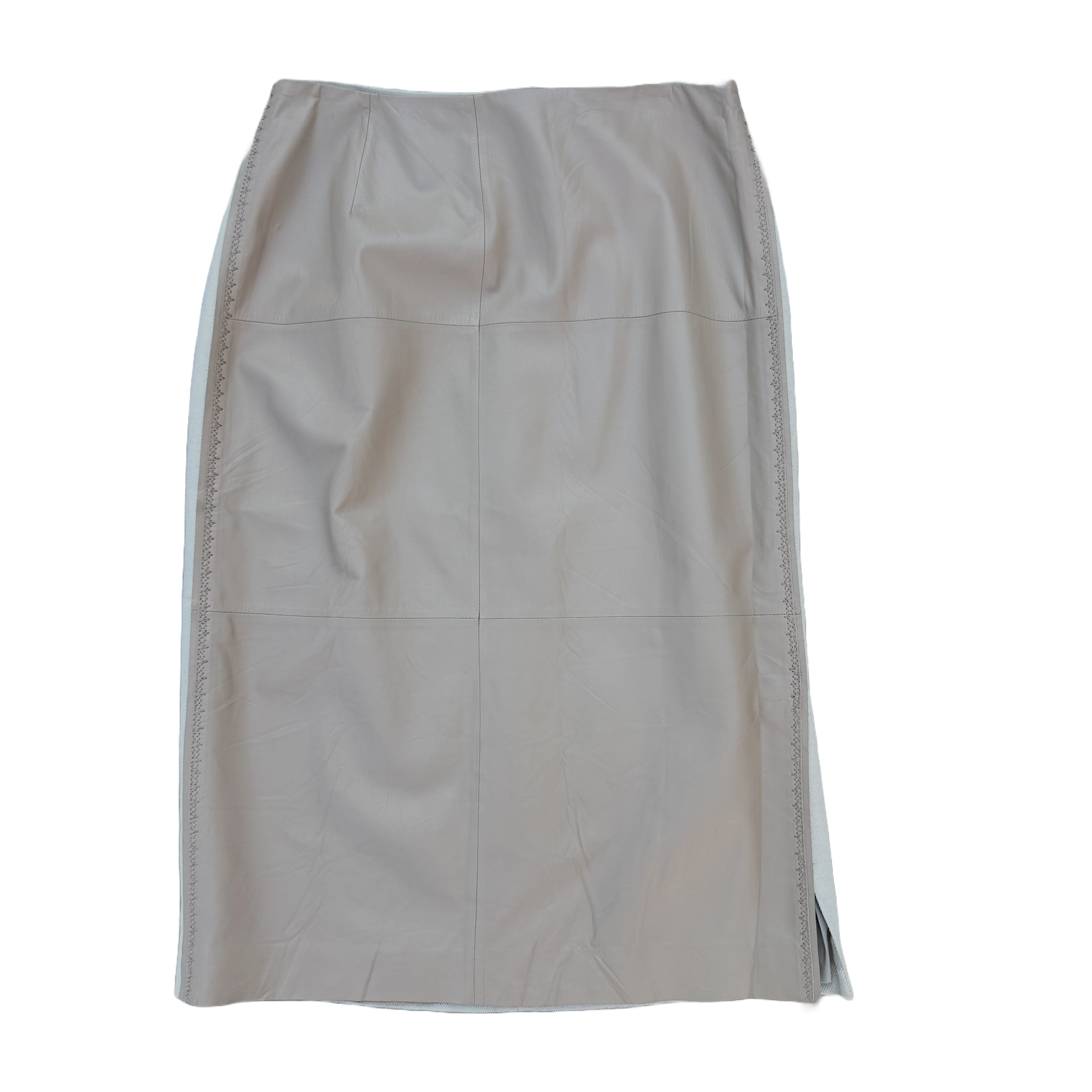 Coqueta falda de cuero, algodón y lino, silueta lápiz, forrada, el frente es de cuero genuino muy suave y delgado en color vainilla latte, la parte de atrás también tiene pinza, método de acceso con cierre invisible, pequeña abertura lateral.