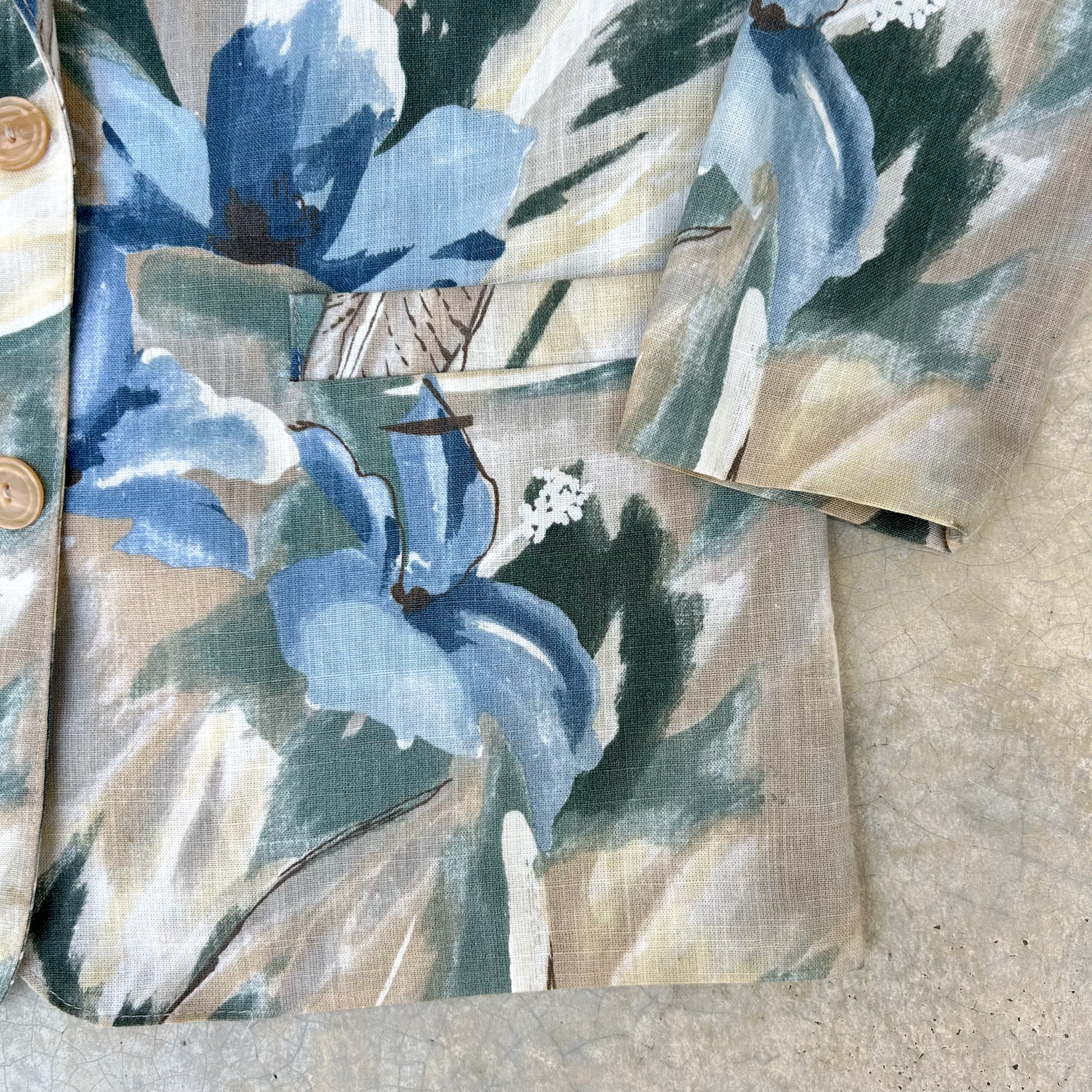 Precioso saco de lino, no tiene forro, estampado floral abstracto parece pintura de oleo en tonos muy armoniosos azul indigo y celeste cielo, verde botella beige, marfil y un poquito de negro, doble bolsillo de ribeteado al frente y doble botón, precioso!