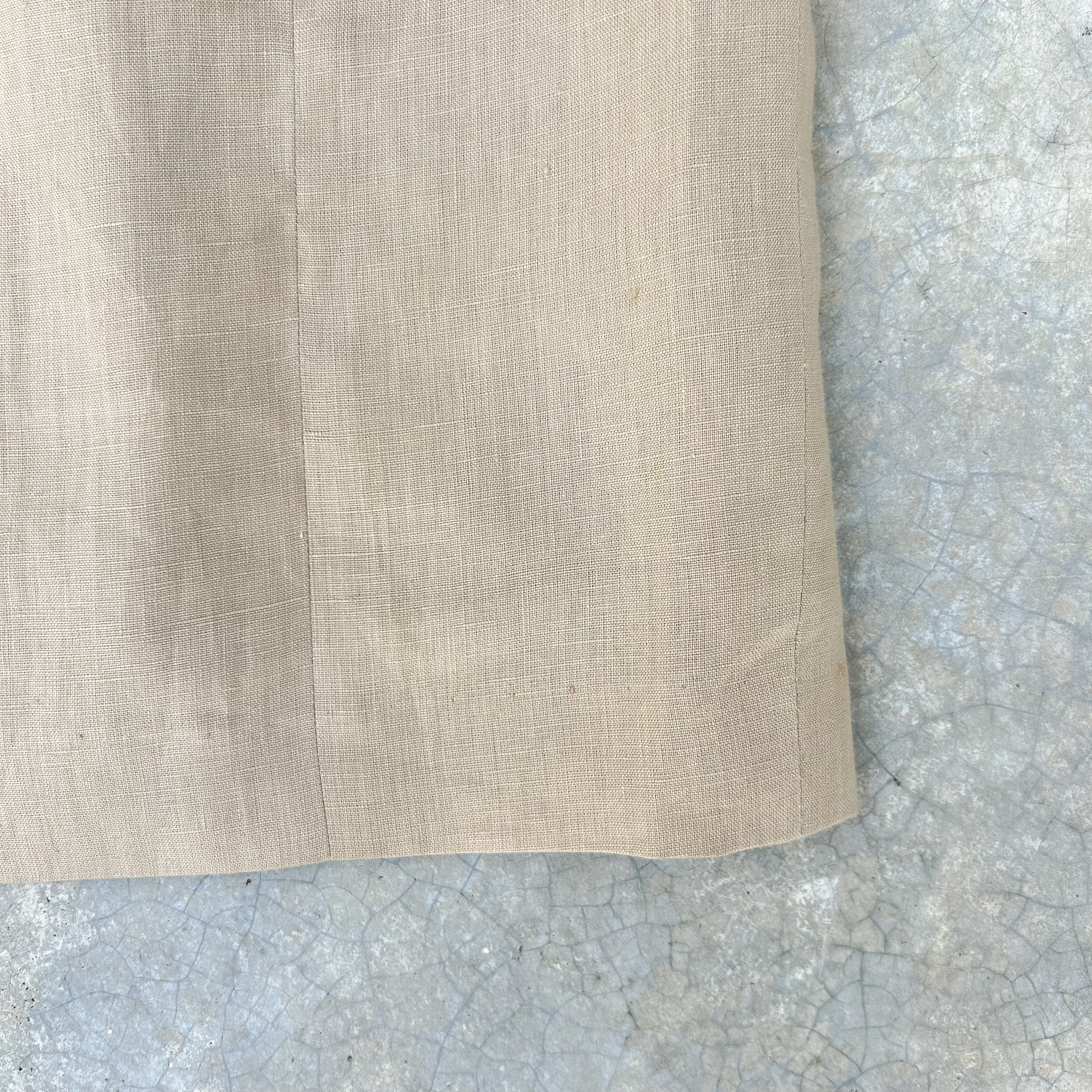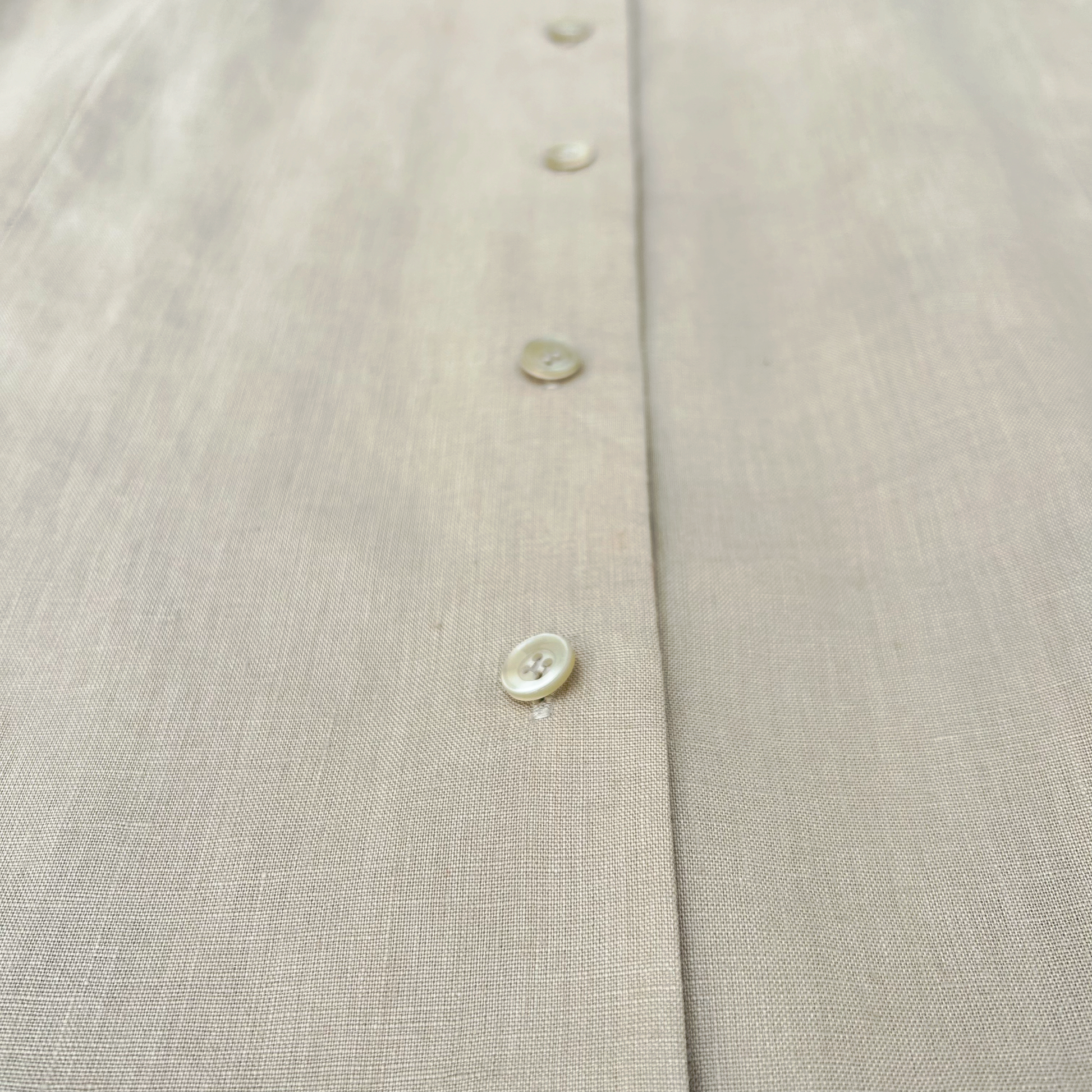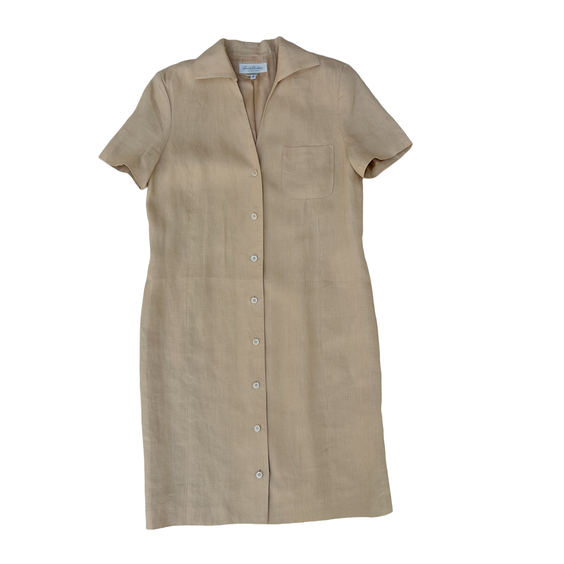 Hermoso vestido camisero de Lino Irlandes, forrado, silueta recta, cuello convertible, escote en V, mini bolsillo redondo al frente, abertura pequeña en espalda, lindo color beige tono avena, es un estilo muy clasico, largo midi, tiene pequeños signos de uso.