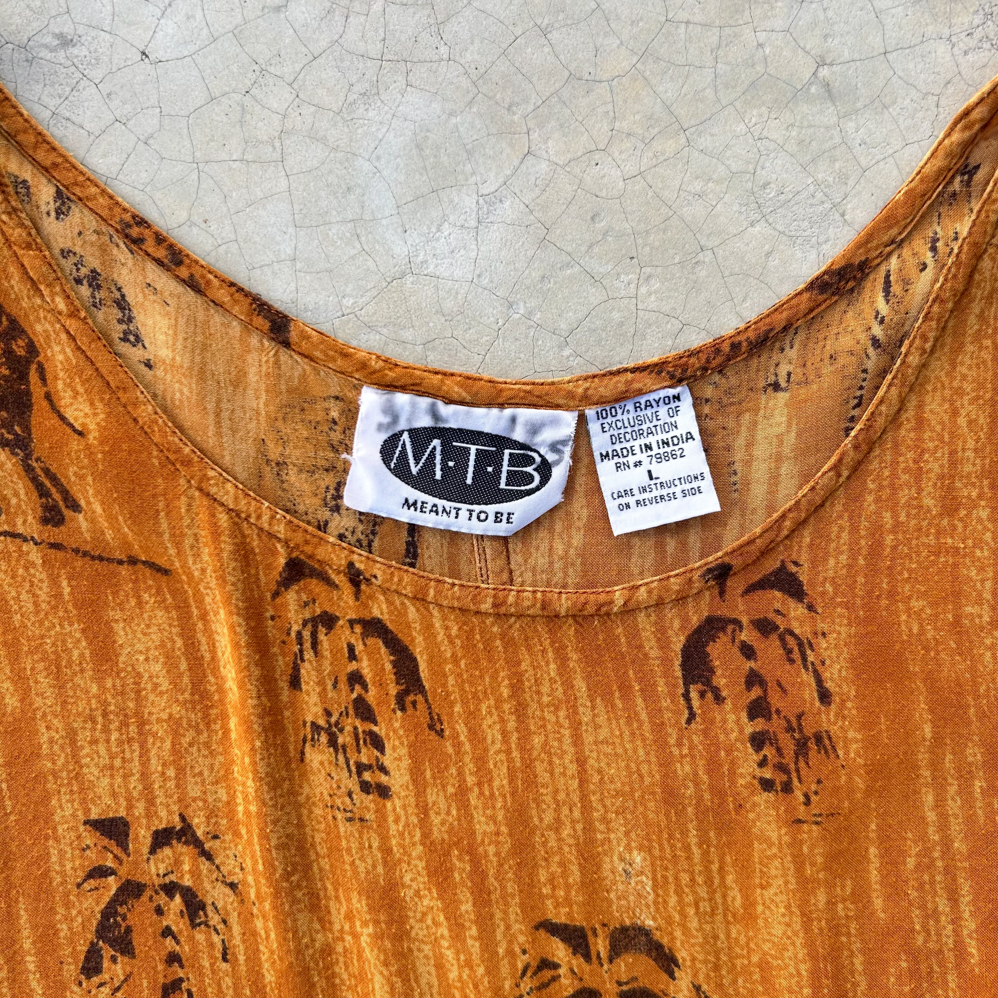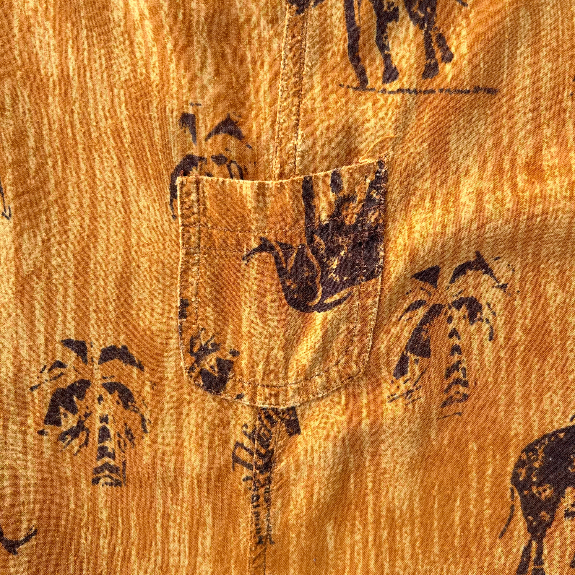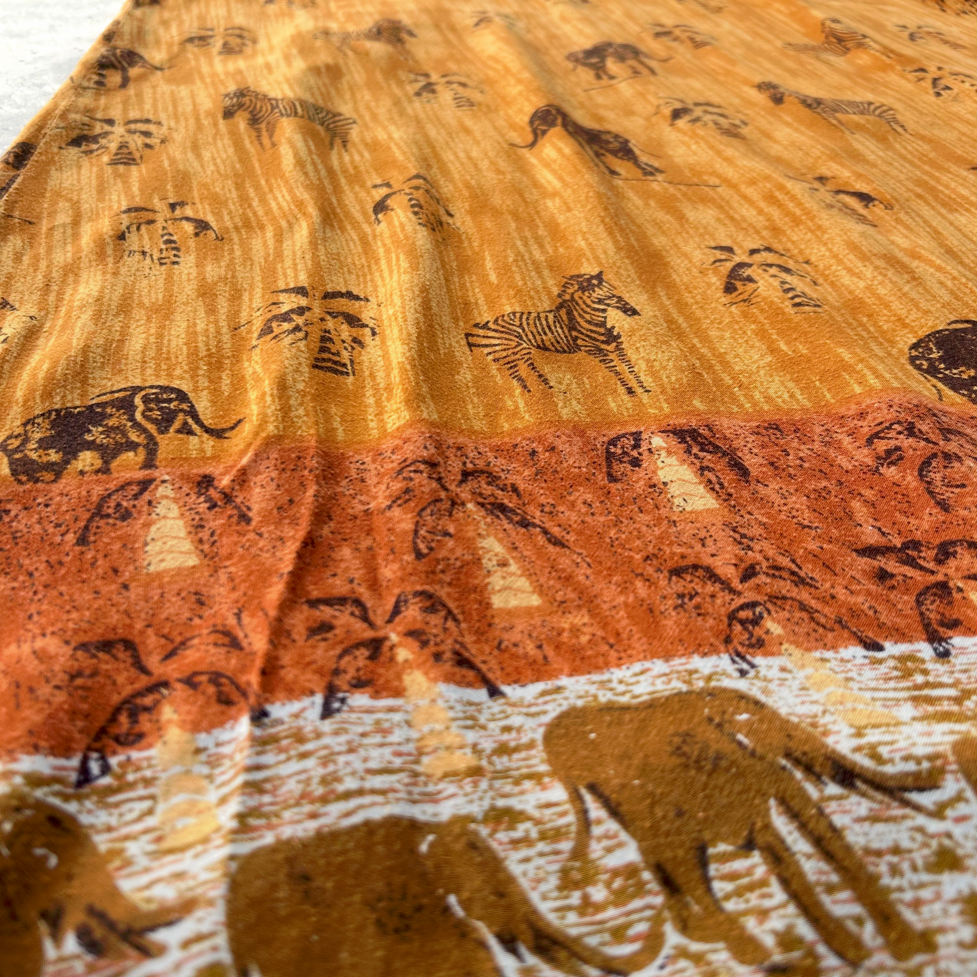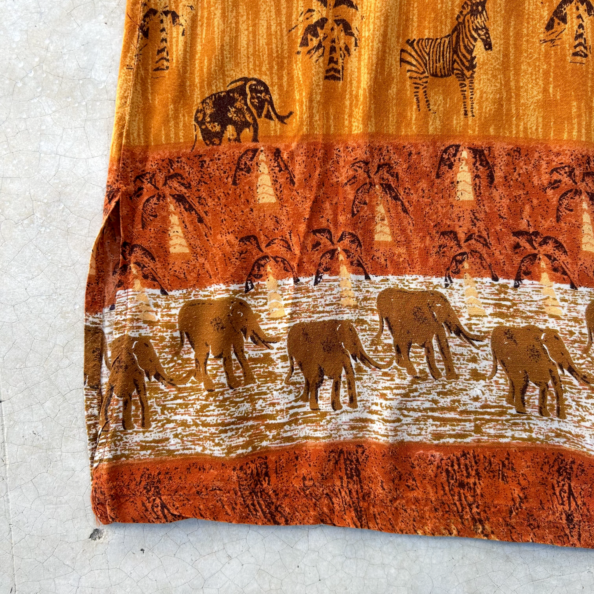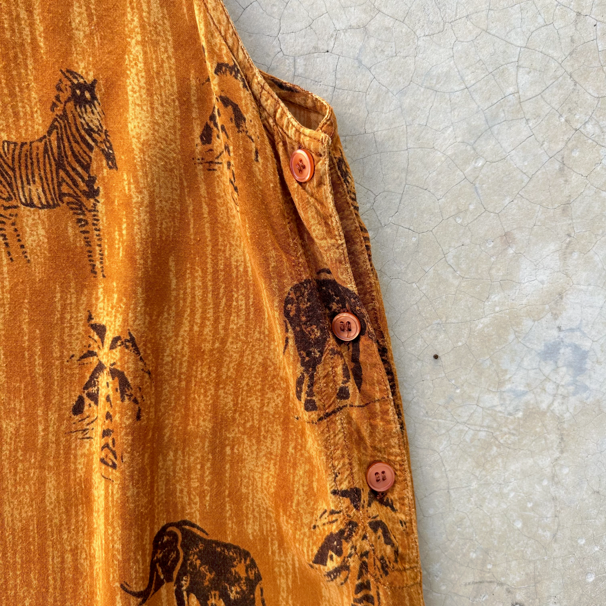 Precioso vestido largo de rayon, silueta en A, pinzas en busto, hermoso estampado de diferentes animales como Cebra, Elefantes, palmeras en tonos naranja ginger, rust y acentos en negro, es ligero y super cómodo, metodo de acceso con botones en costado, tiene pequeños signos de uso.