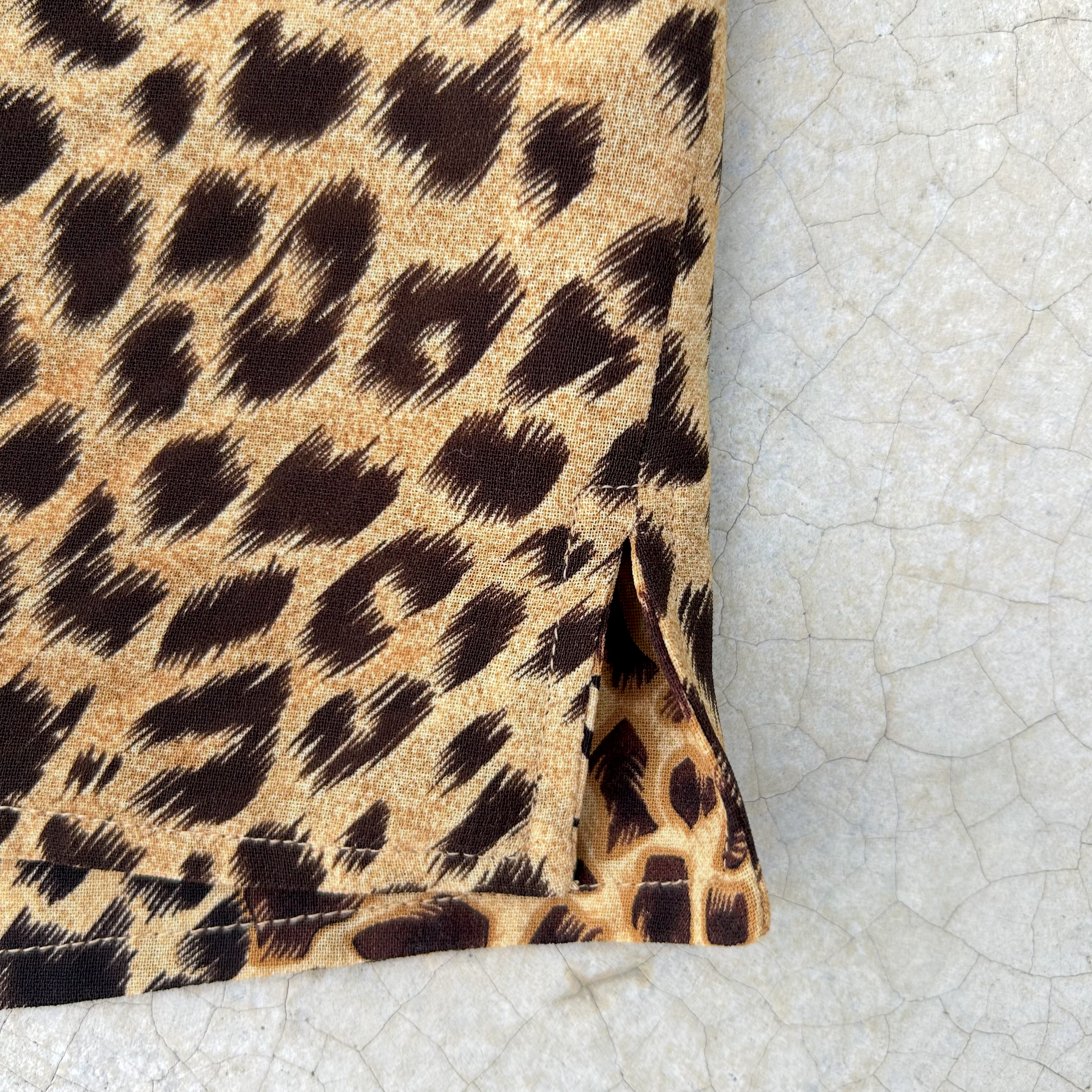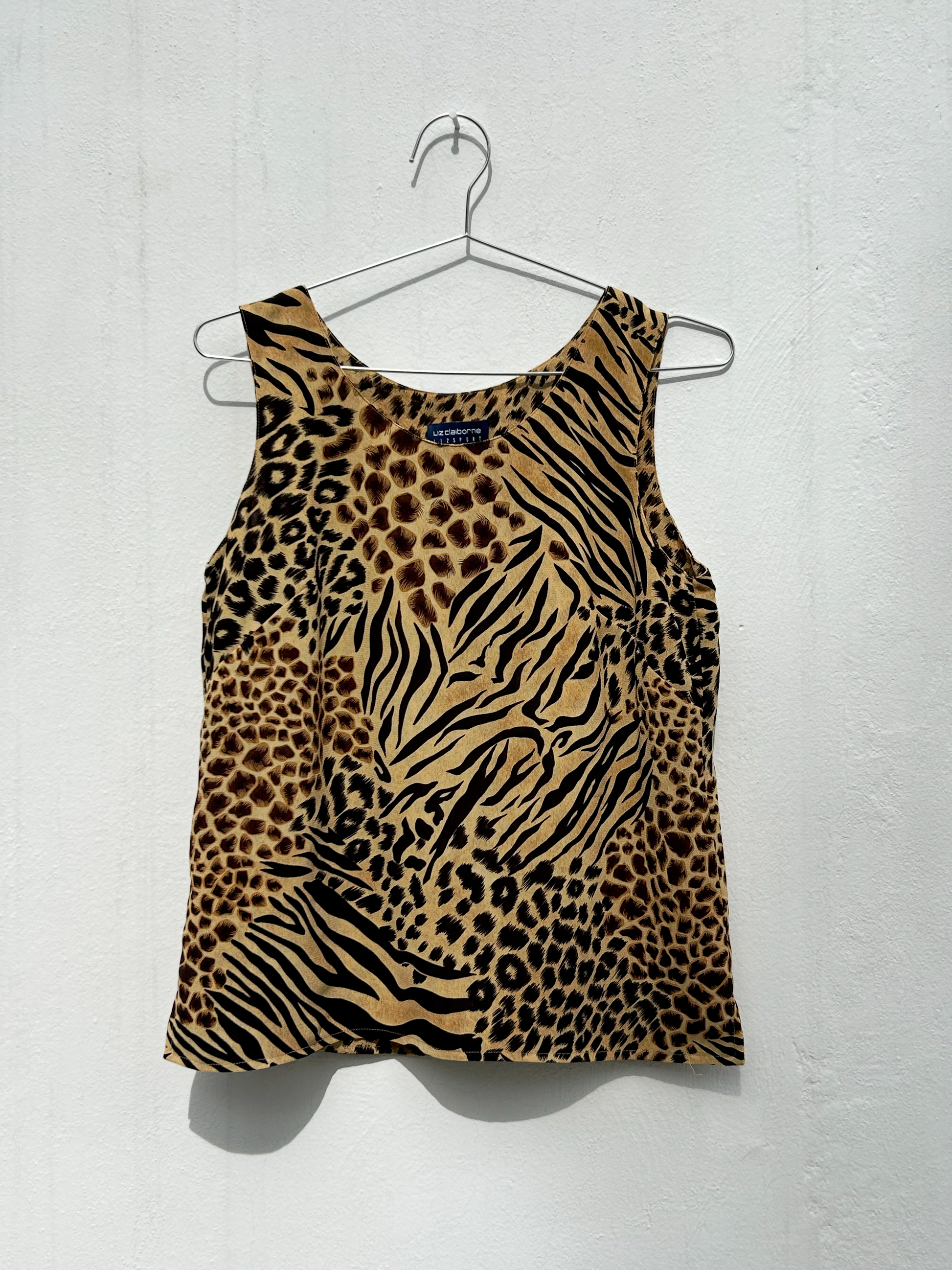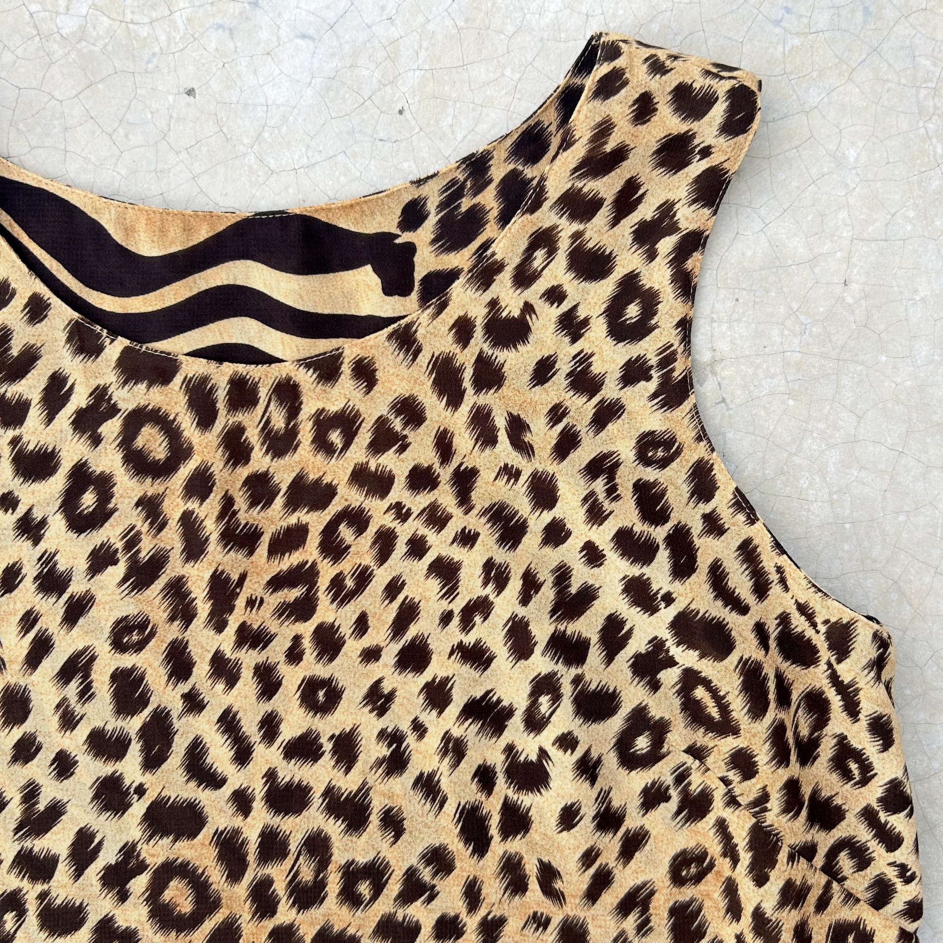Linda blusa de poliéster, silueta recta con pinzas en el busto, estampado de Cheetah de un lado y Cebra con Jirafa del otro, fondo color desierto jaspeado, solo hay que remover la etiqueta para poder intercambiar, mini aberturas en los costados, es ligera y con excelente caída.