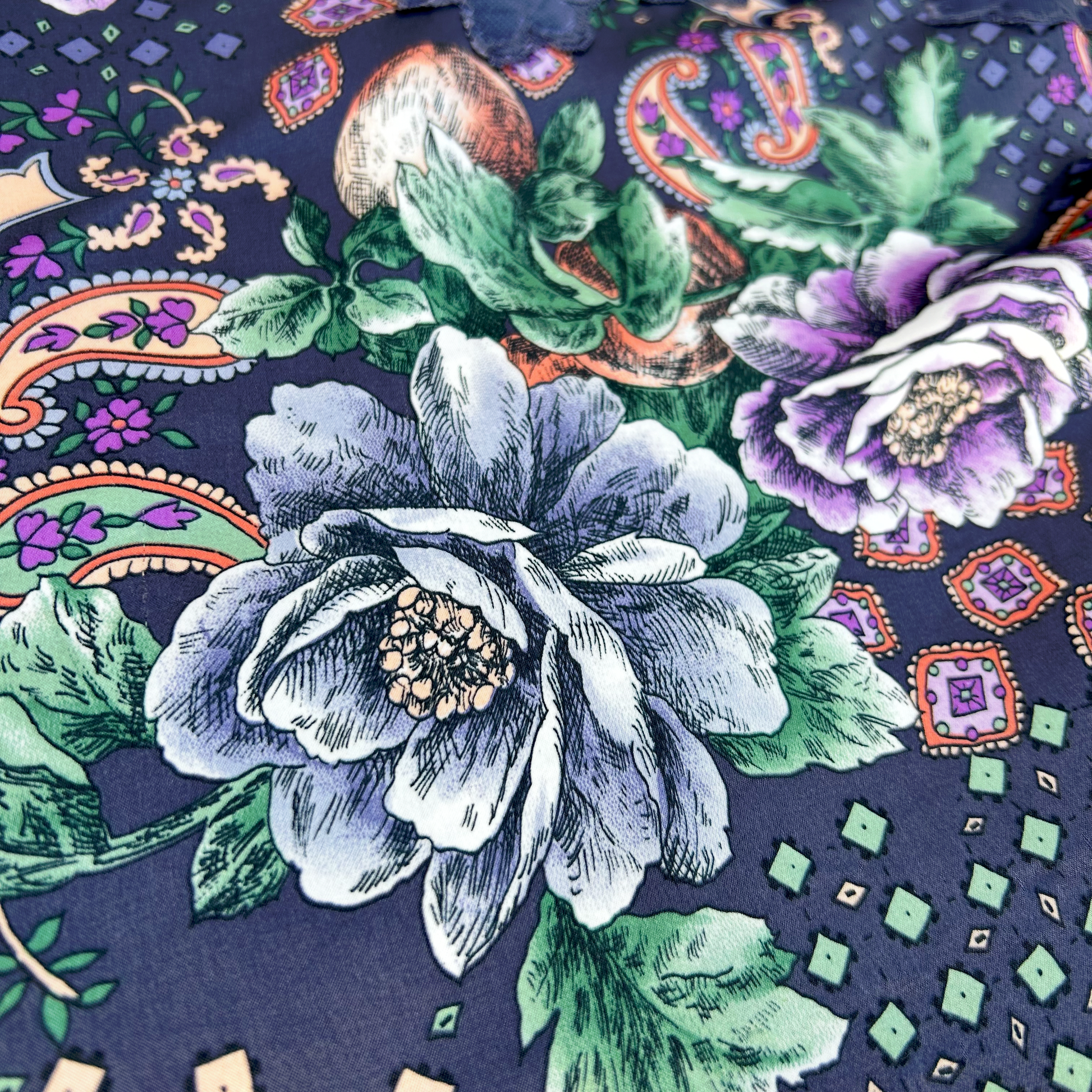 Lindo vestido lencero de poliéster, escote profundo en V con aplicación de encaje al igual que en costados ruedo en color Uva oscuro, estampado de rosas en tonos purpura y violeta con verde botella y algunas figuras geométricas, tirantes de espagueti ajustables, escote profundo en espalda.