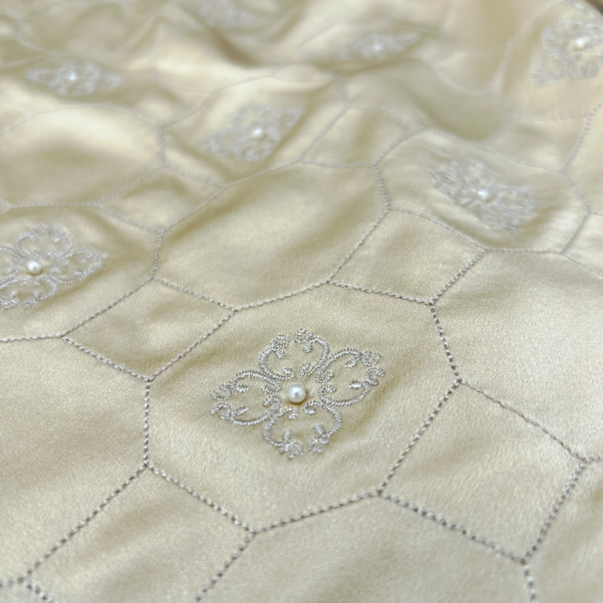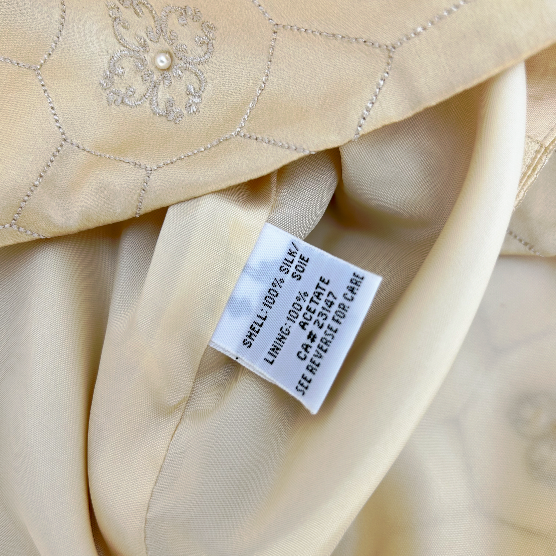 Exquisito saco de seda, tiene un brillo lujoso, forrado, escote redondo, capitaneado al frente incluyendo bordado de flores con una perlita en medio, corte princesa desde sisa en espalda entrallando figura, es cortito y talla divino, botones forrados, soñado color Champagne casi dorado.