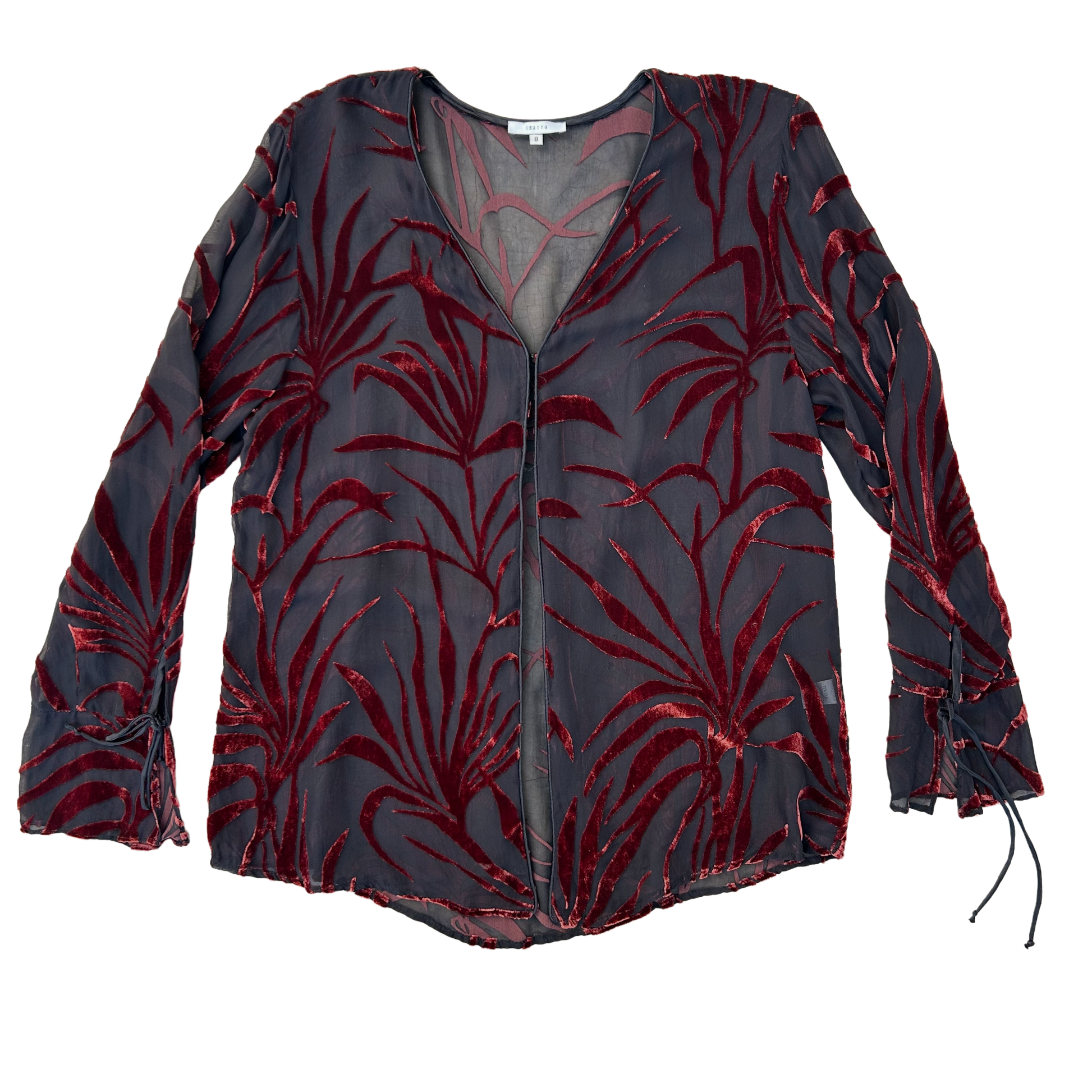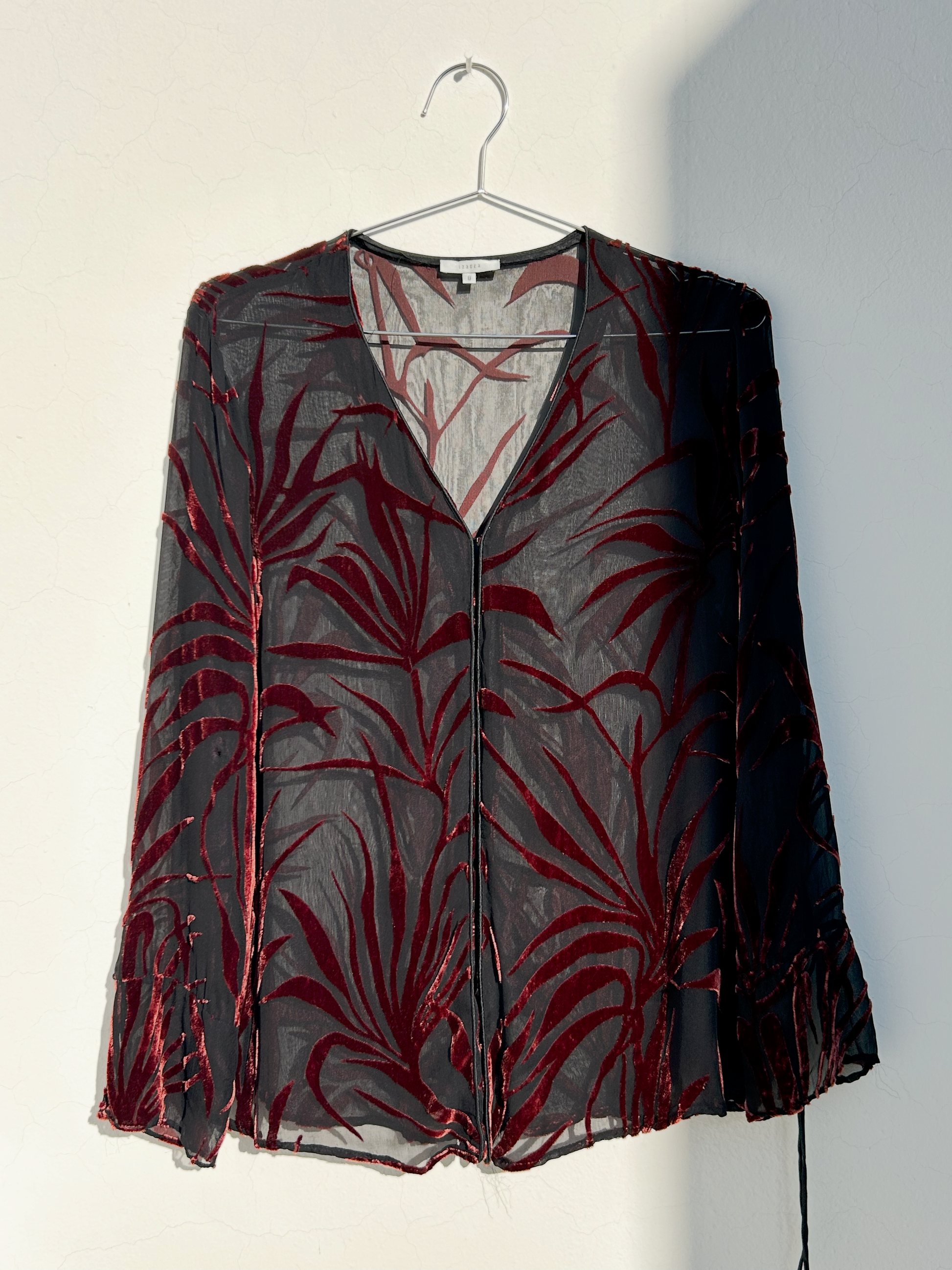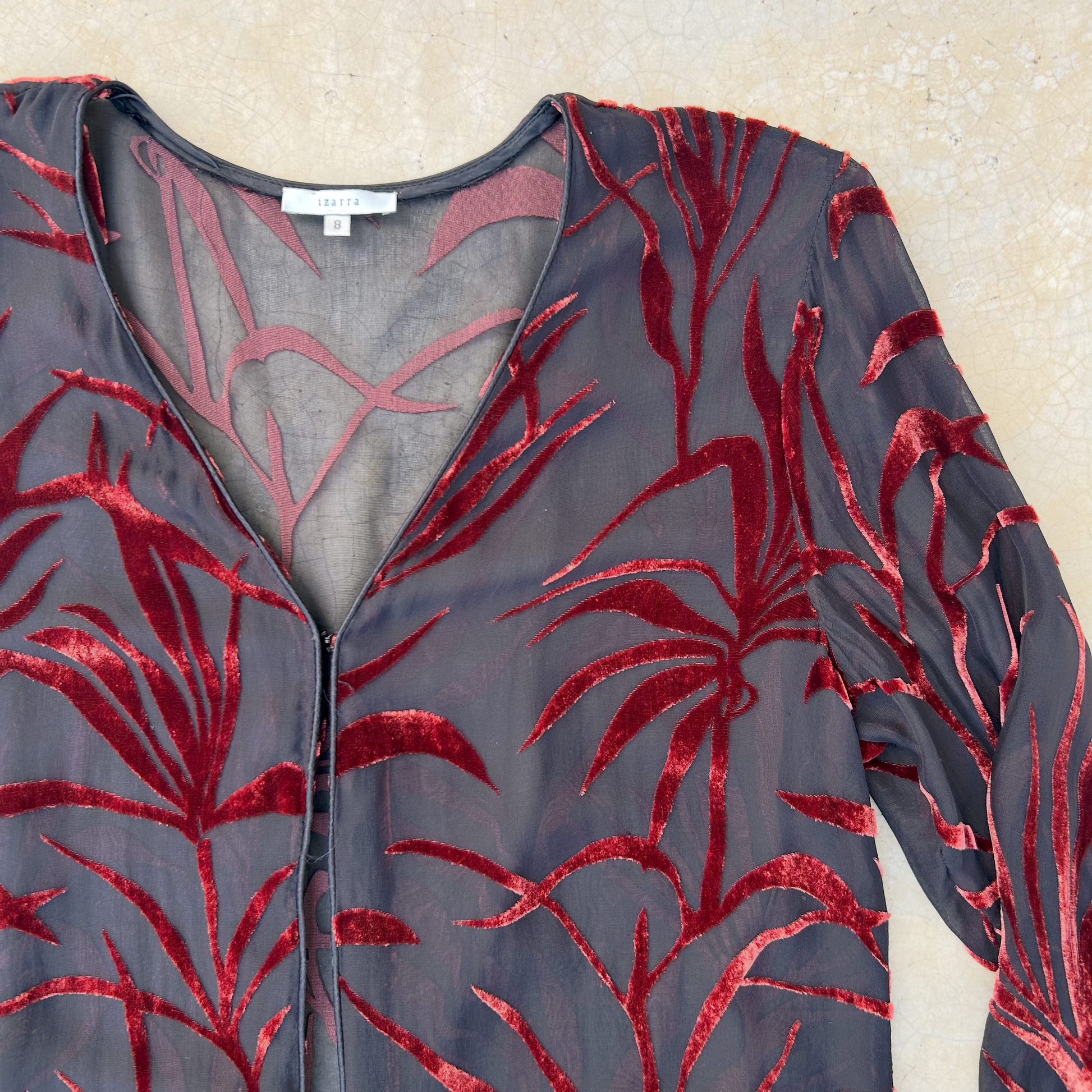 Coqueta sobre blusa mezcla de Chifon seda con poliester, escote en V, con un unico broche en el busto, estampado de hojas en terciopelo color rojo escarlata, preciosa caida, tiene pequeños signos de uso.