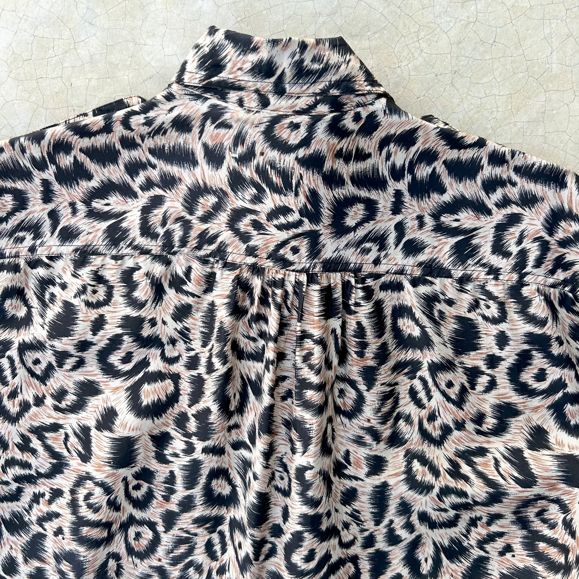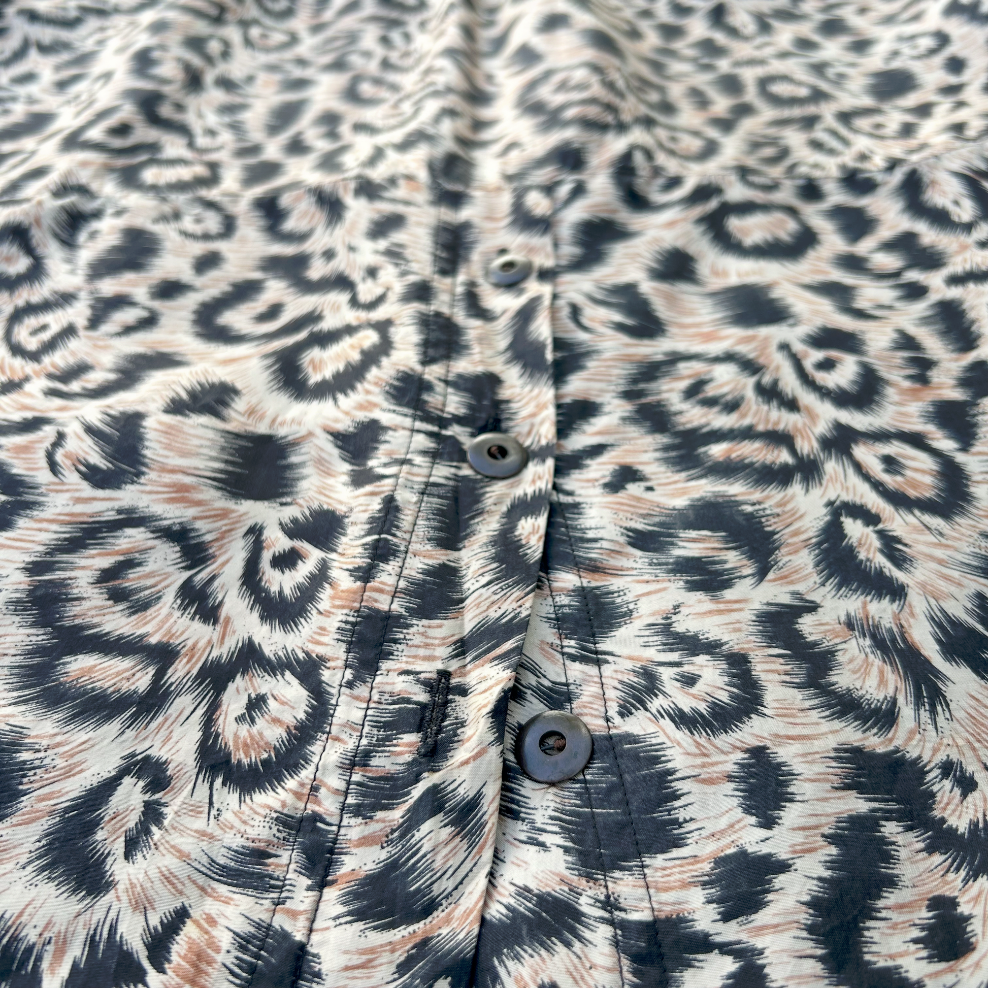 Hermosa chamarra de seda, es mas como una sobre camisa, estampado de Cheetah en tonos negro con destellos color cafe chocolate fondo beige, silueta recta, botones escondidos metálicos, tres bolsillos al frente con solapa y botón, charretera en hombros, canesú en espalda ligeramente fruncido, abertura en ruedo a nivel de cadera, largo llega a medio muslo aprox, una coqueteria!