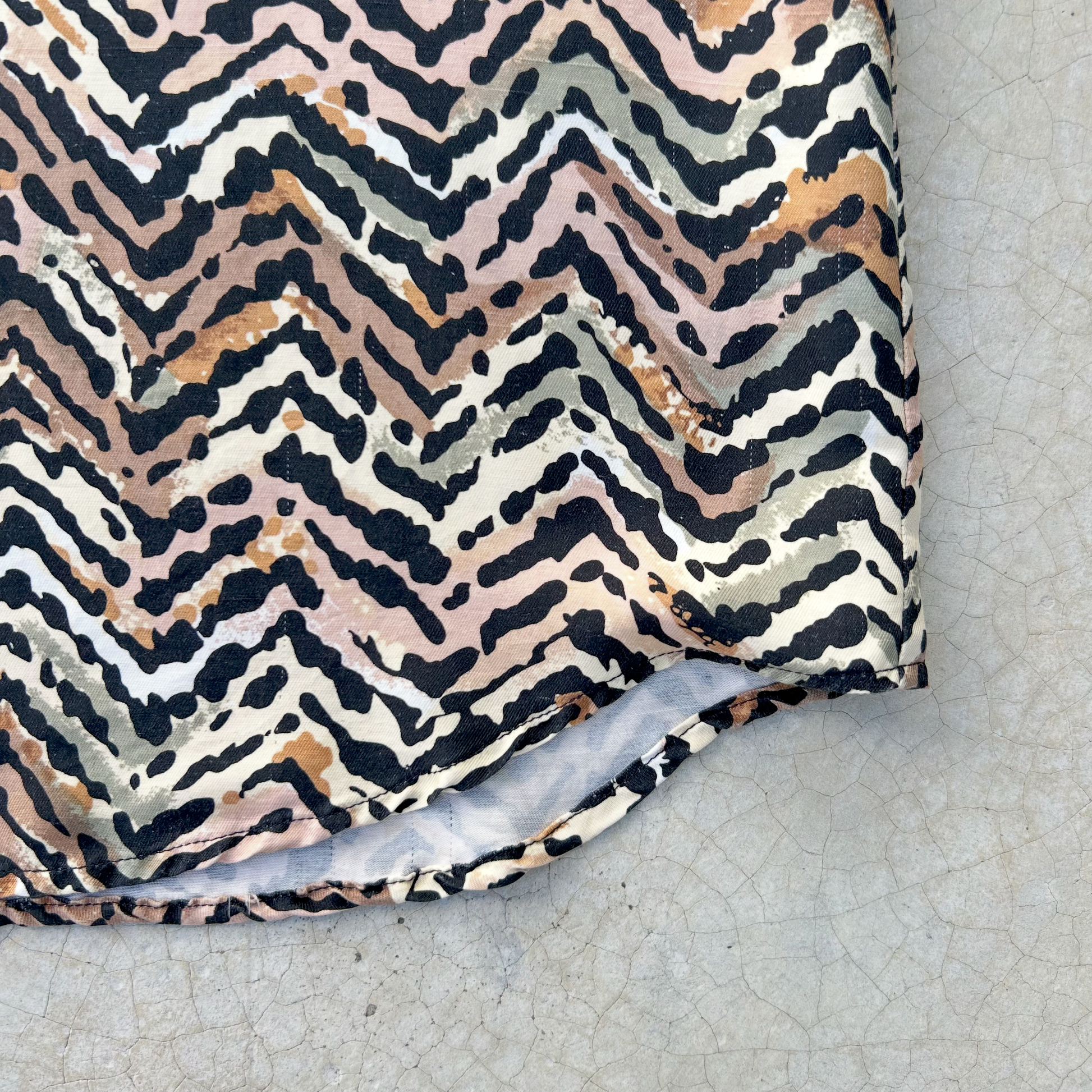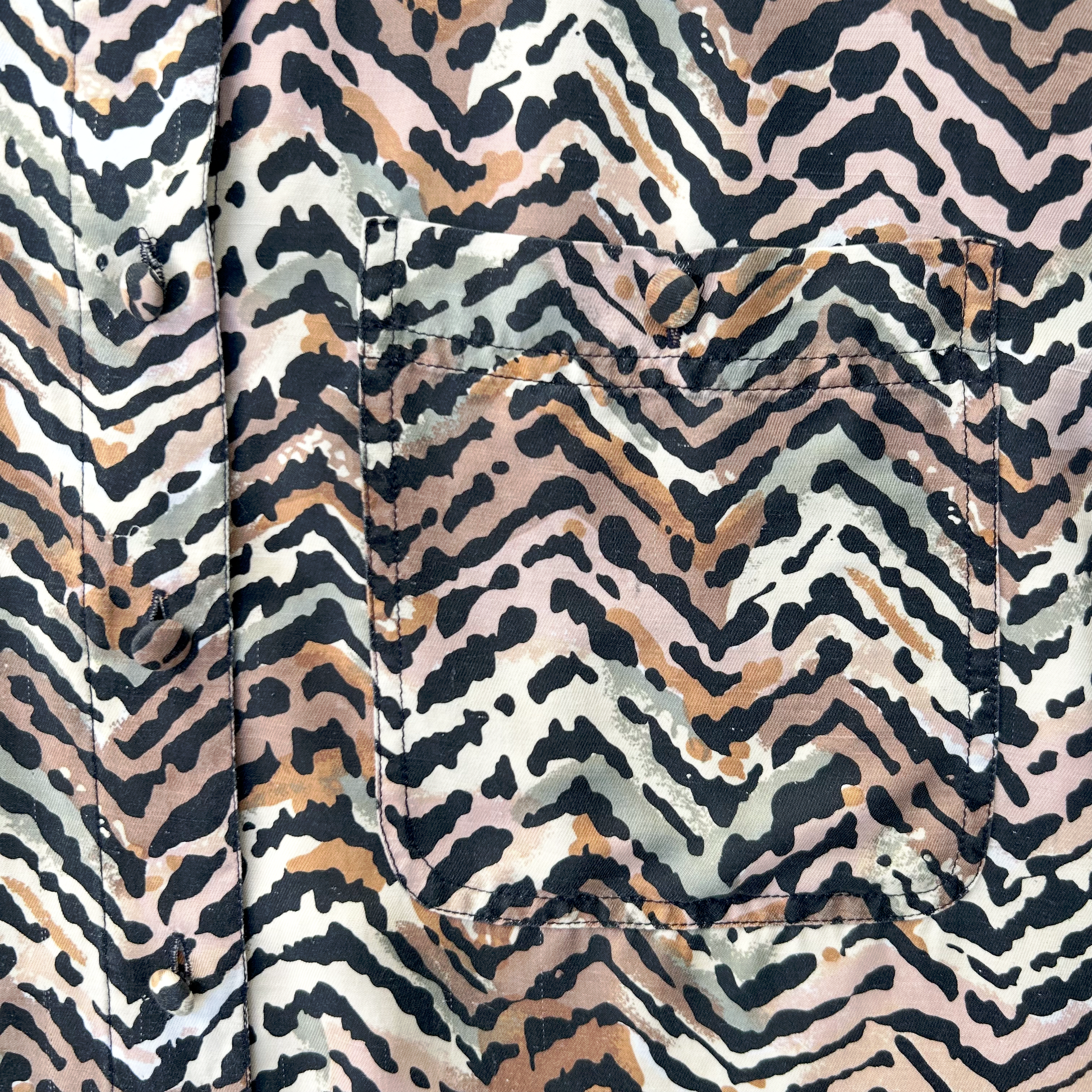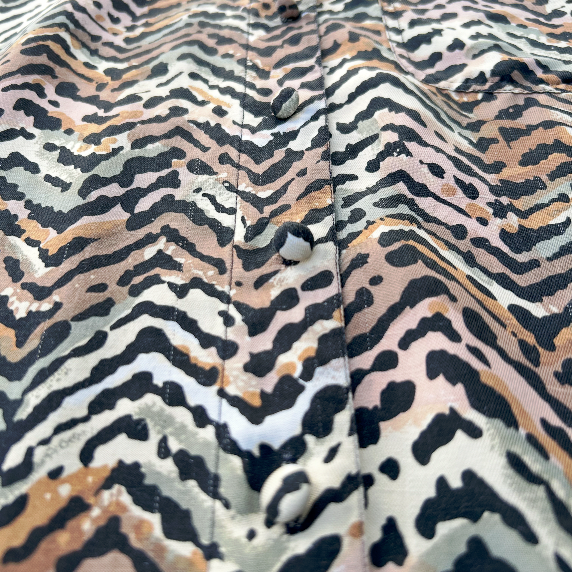 Preciosa camisa de seda, la textura es como de durazno, estampado estilo acuarela de Cebra en color negro, fondo en tonos pasteles, verde olivo, palo rosa, cafe caramelo y marfil, bolsillo al frente cuadrado, botones forrados, una preciosura!