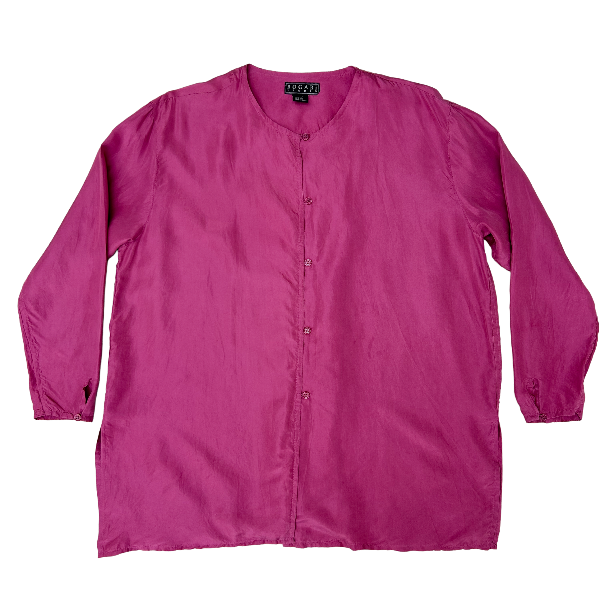 Hermosa camisa de seda pañuelo, extra suavecita y muy ligera, escote redondo, manga 3/4, precioso tono magenta, aberturas medianas a los costados.