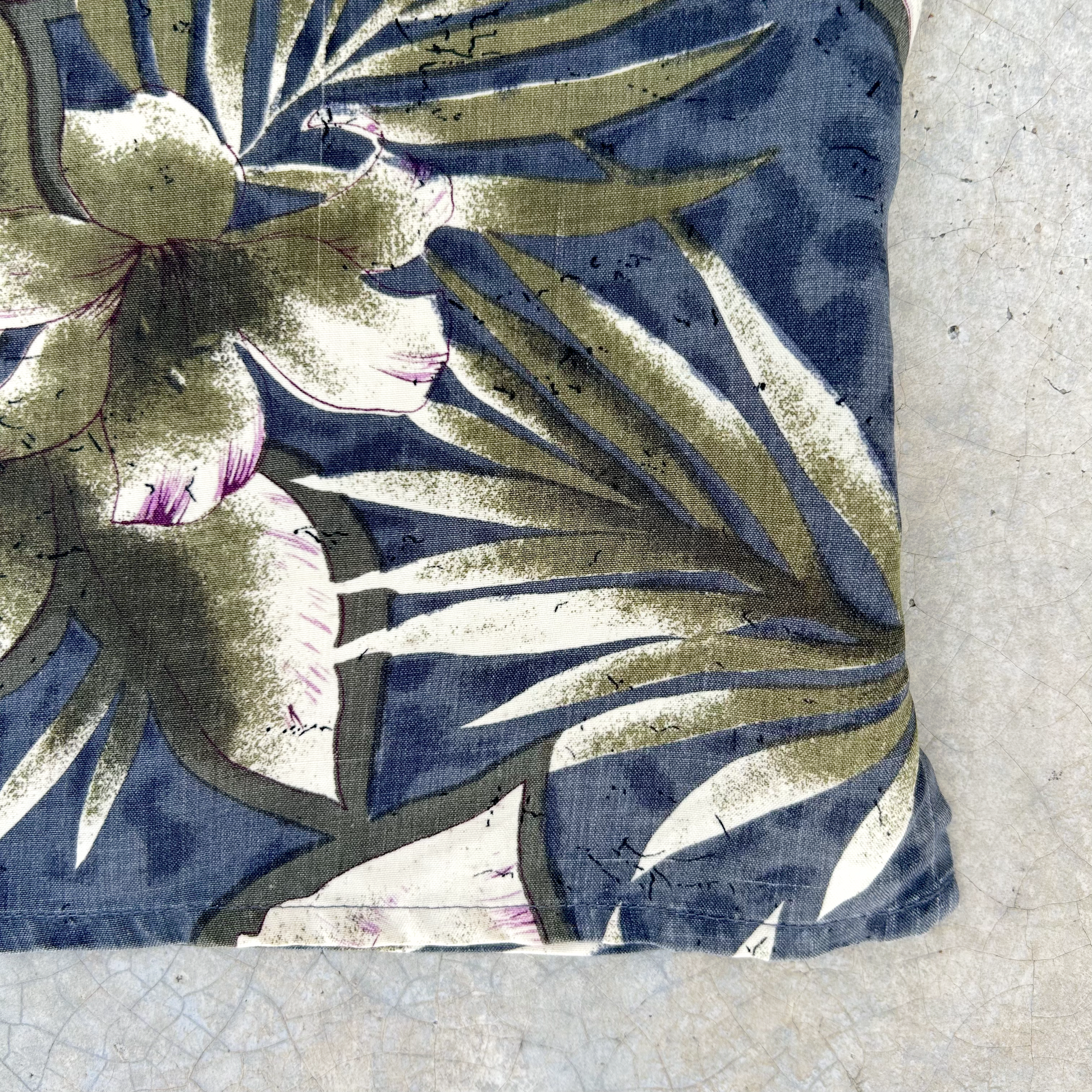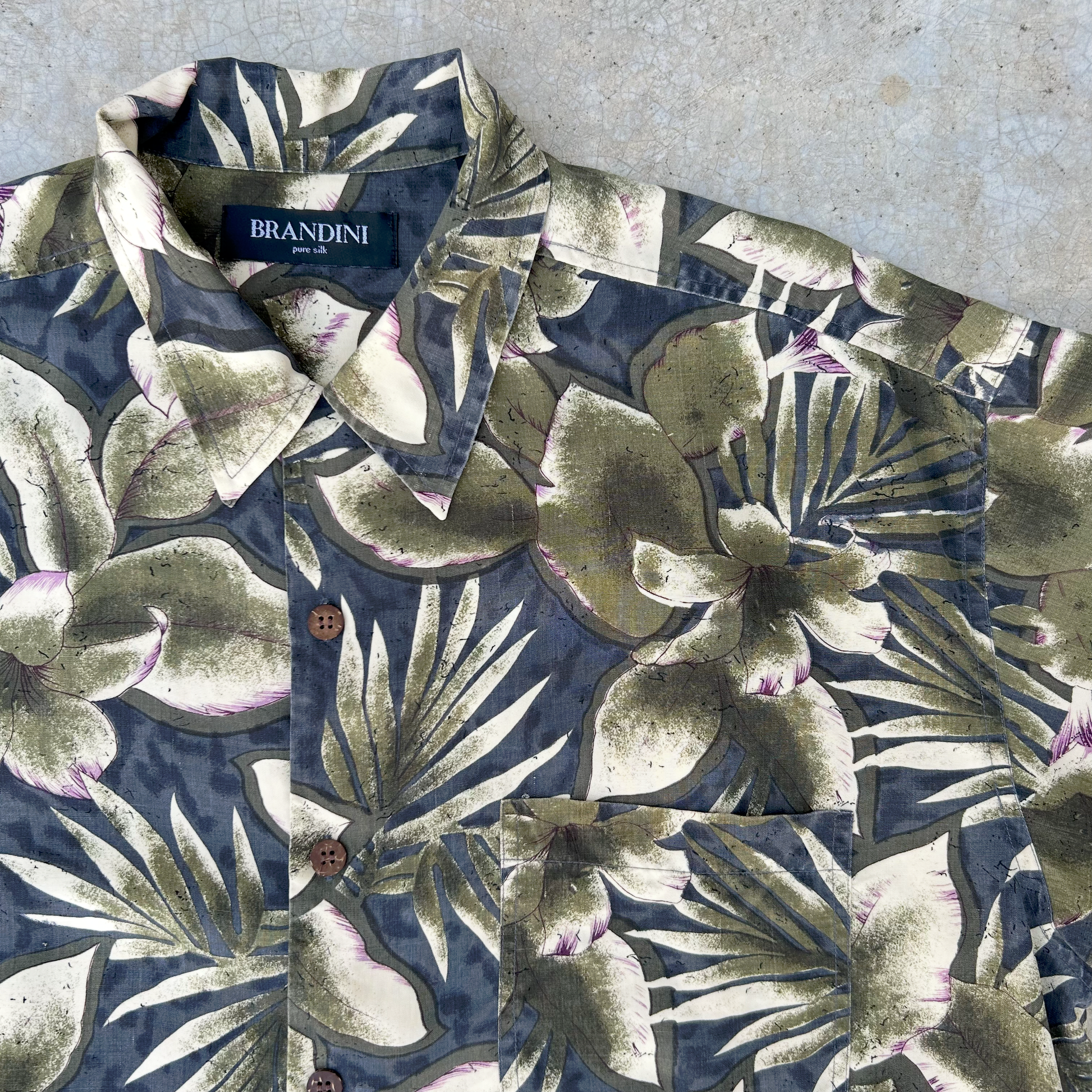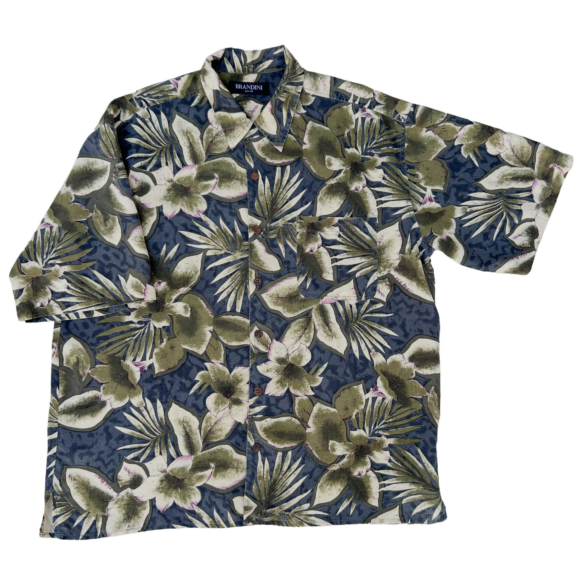 Pure Silk - Linda camisa de seda, super suave y muy ligera, estampado floral oversize en tono verde musgo y marfil con acentos en violeta, fondo gris azulado, mini aberturas en costados, bolsillo redondo al frente, botones de coco.
