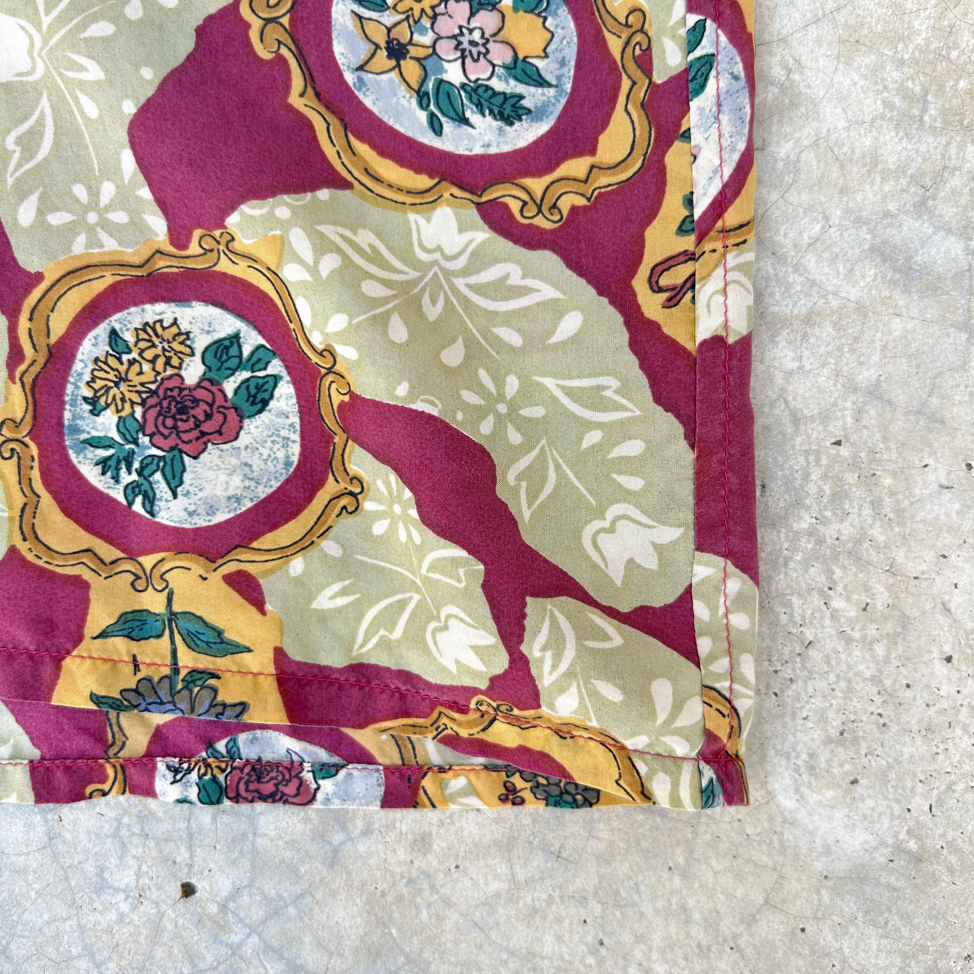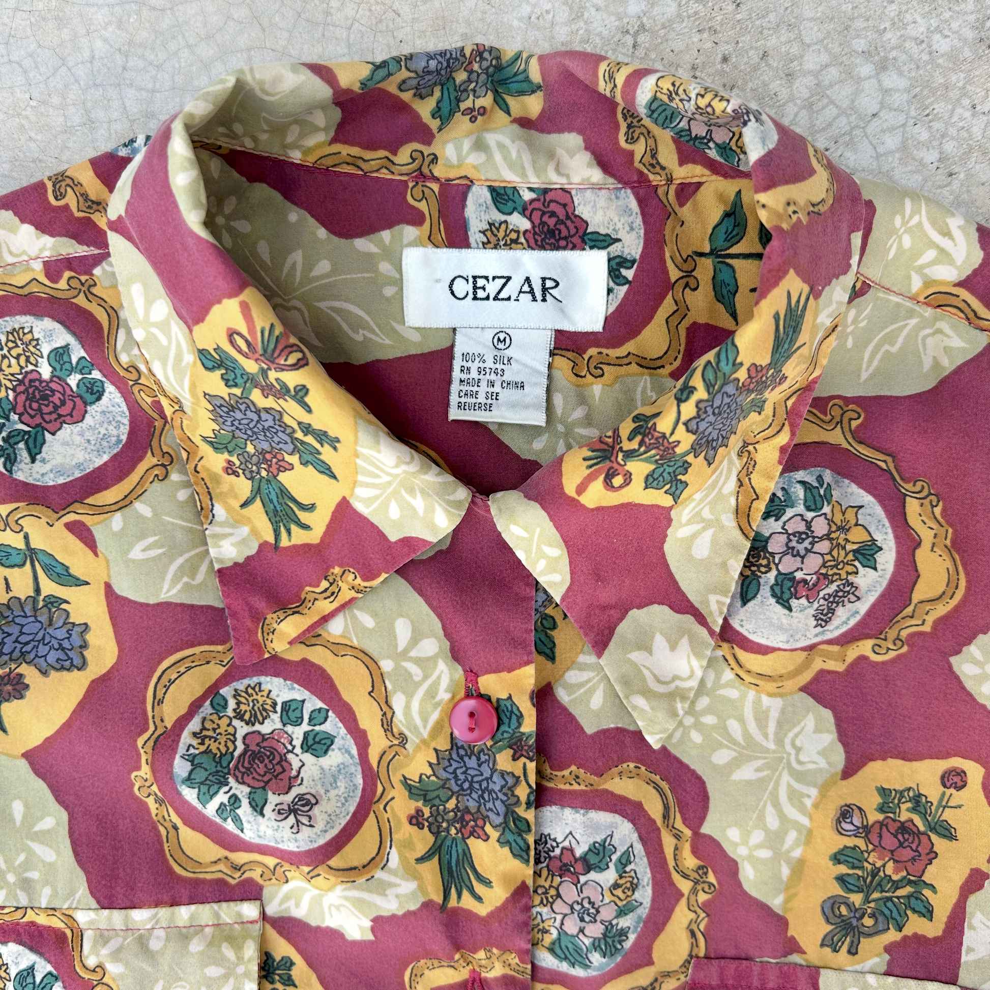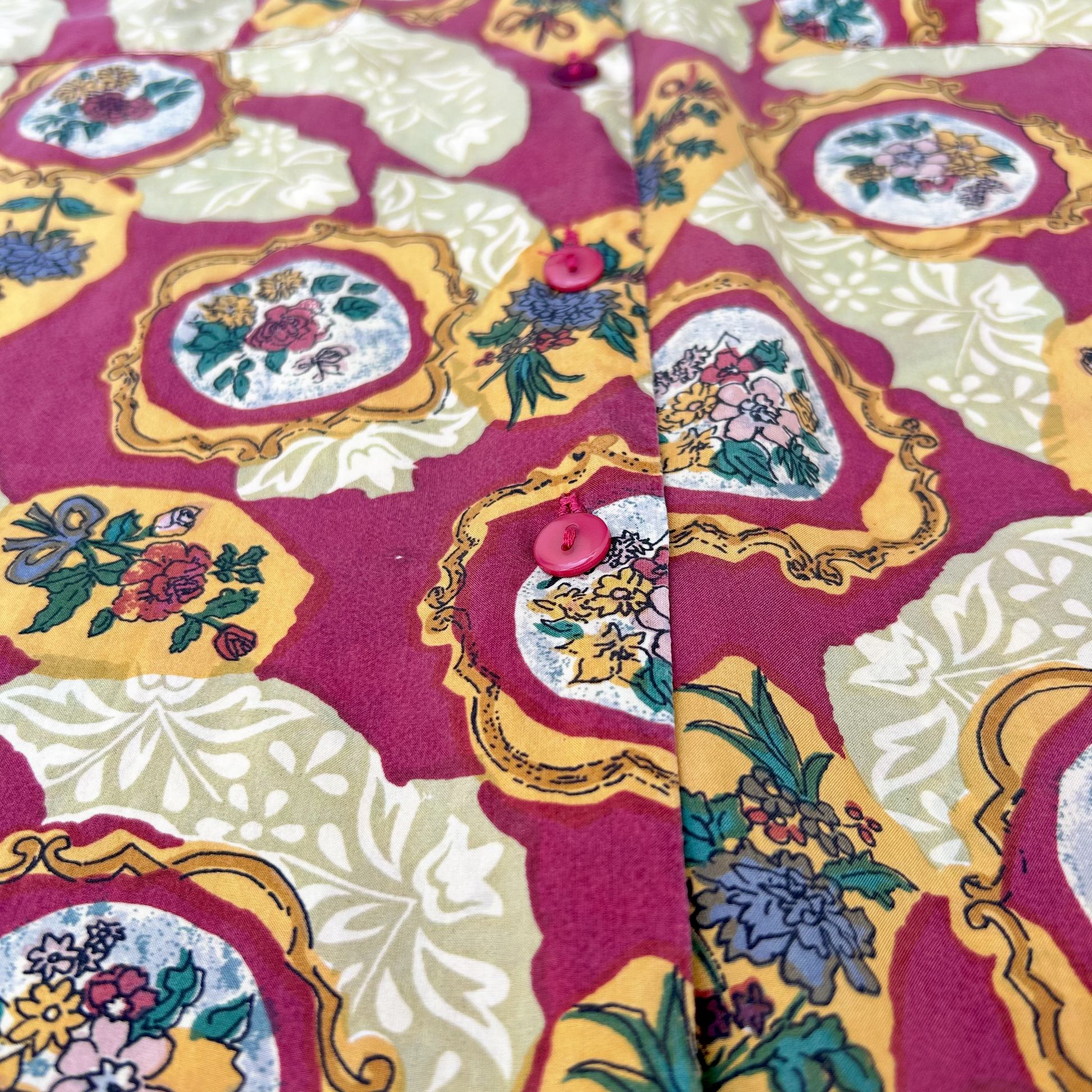 Guapa camisa de seda pañuelo, estampado de bouquet de rosas en tonos mostaza, verde botella, blanco, con fondo rosa Rosewood, doble bolsillo con solapa al frente, es suuper livianita!