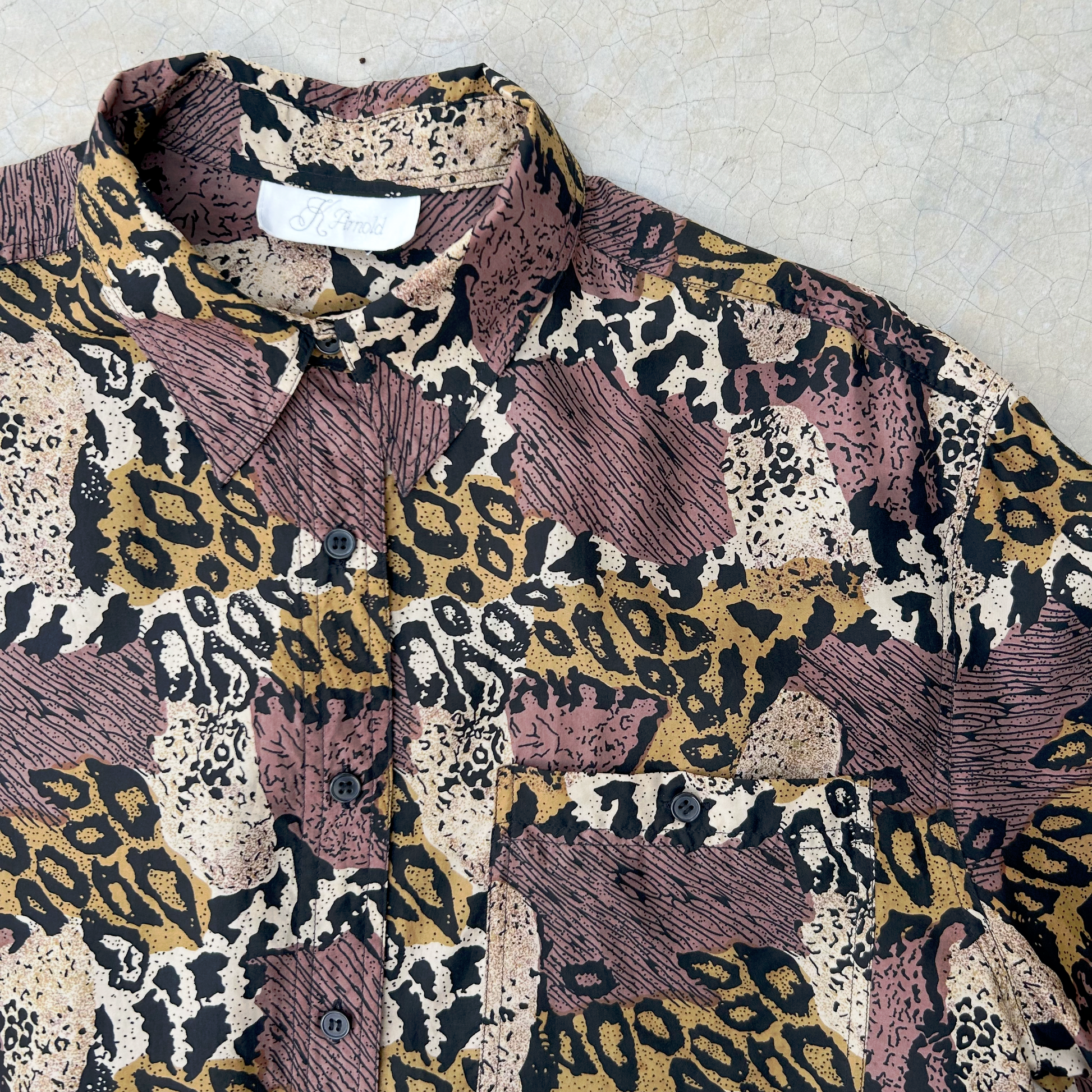 Preciosa camisa de seda pañuelo, extra suave y ligera, estampados varios en bloques cuadros de Jaguar en tonos de cafe Sepia, Moka, Chocolate, Greige y negro, bolsillo cuadrado al frenteo on boton, divina!