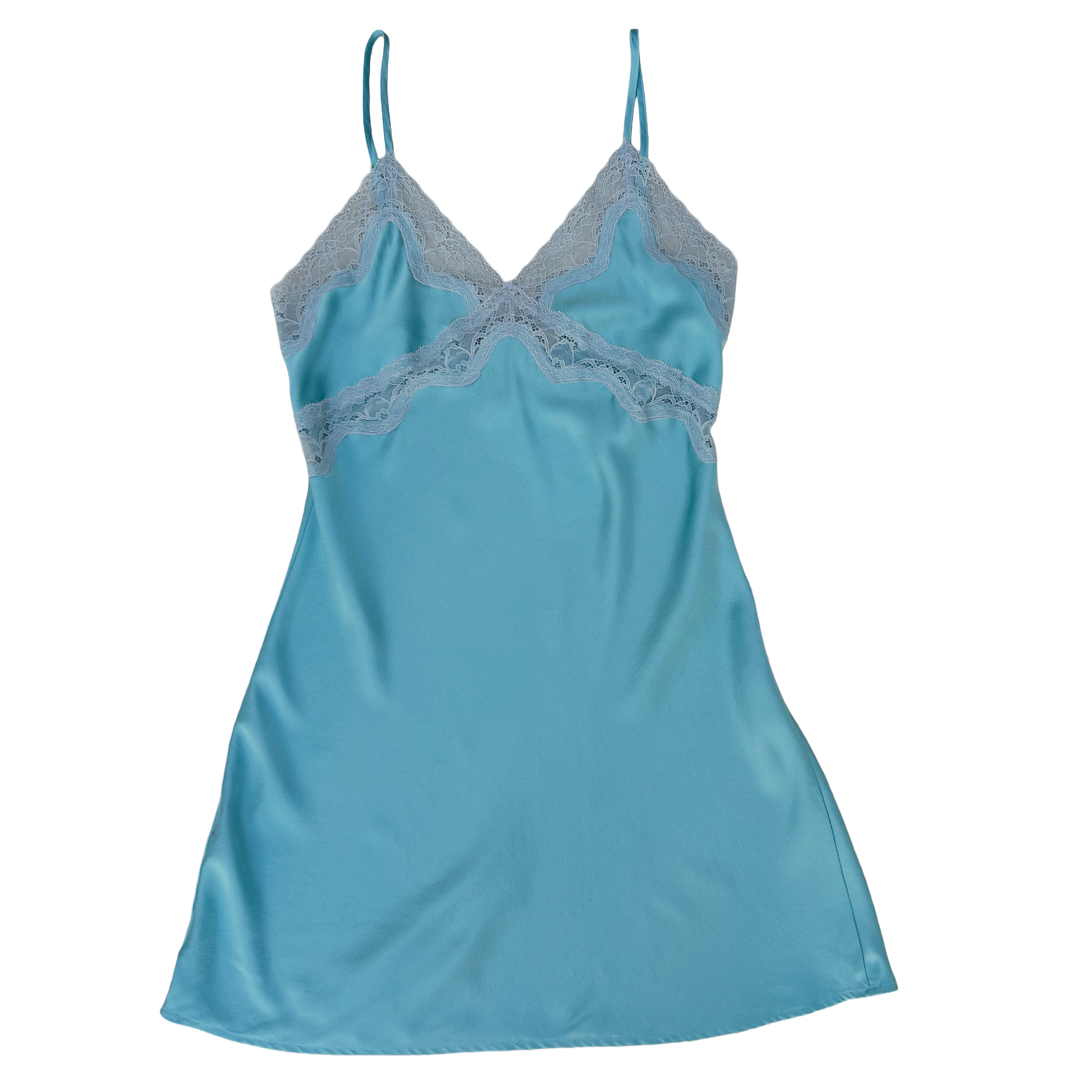 De la diseñadora de NY - Exclusivo vestido lencero de seda, liquida, extremamente suave, silueta ligeramente en A, corte imperio abrazando el busto, escote en V con aplicación de encaje importado de Italia en color gris perla, tirantes de espagueti ajustables, hermoso color azul Aguamarina, nuevo sin etiqueta, una Joya!!