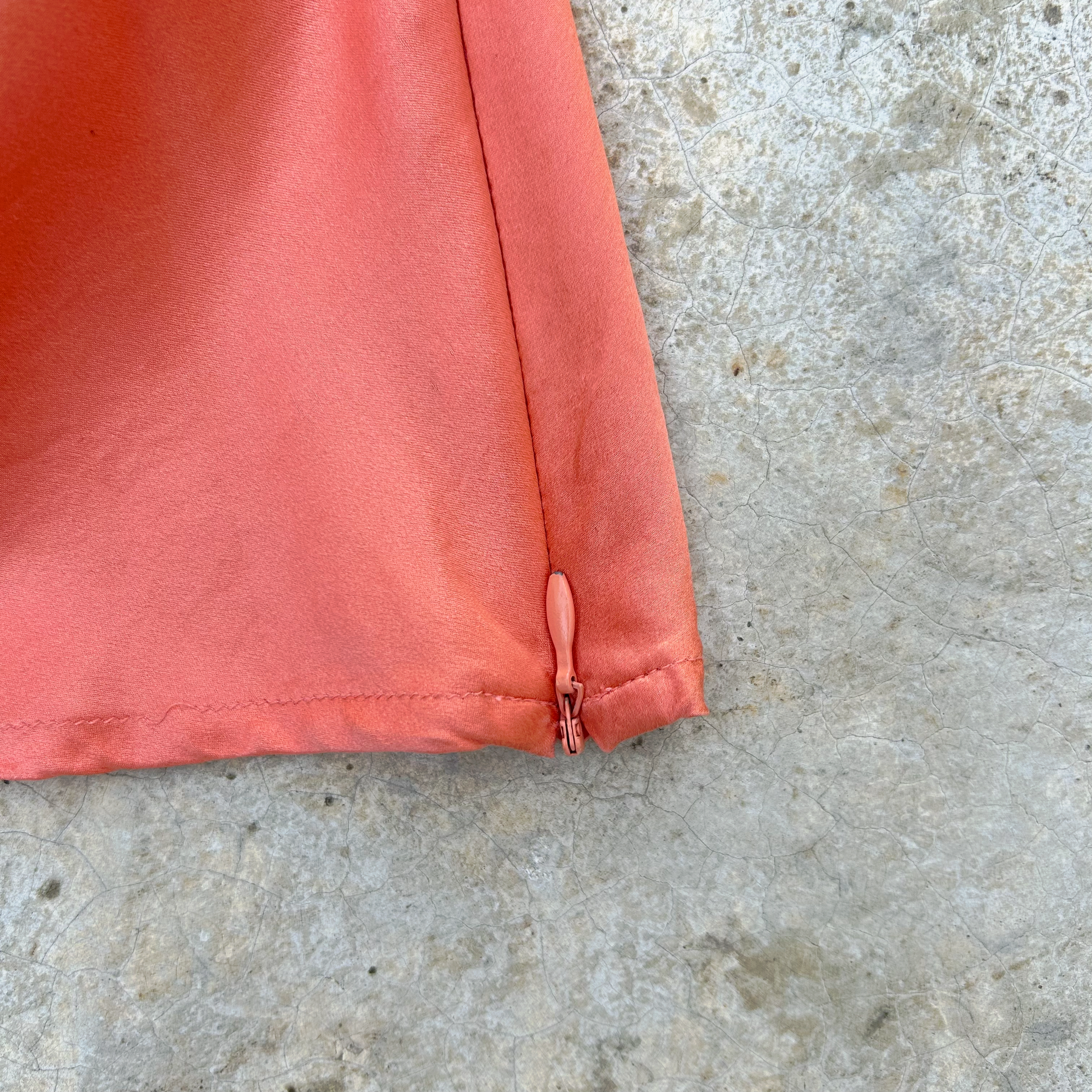 Hermosa blusa de Charmeuse de seda, tiene un brillo lujoso, corte impero entallando el busto con ligero y delicado encaje en escote al igual que bordado de hojas con mostacillas, esta estructurada para ser pegadita al cuerpo, cierre invisible al costado, tirantes espagueti ajustables, hermoso color Coral.