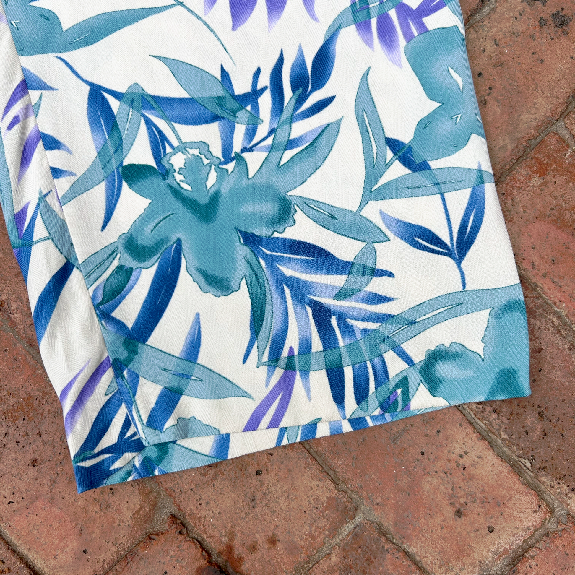 Preciosos pantalones de seda, tienen un poco de textura, excelente caída, bolsillos escondidos a los laterales, elástico en pretina espalda, estampado de flores y hojas en tonos azul Bondi y Lavanda con fondo color marfil, muy coquetos, son nuevos con etiqueta.