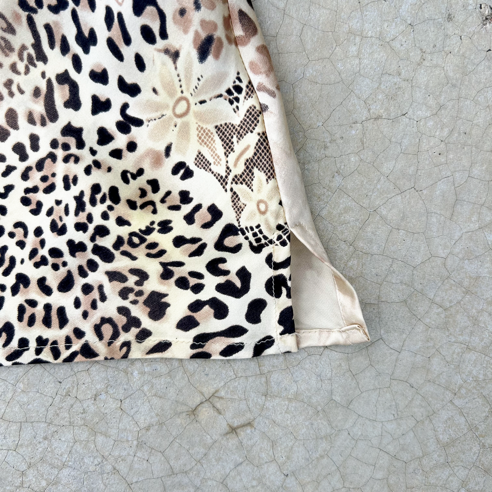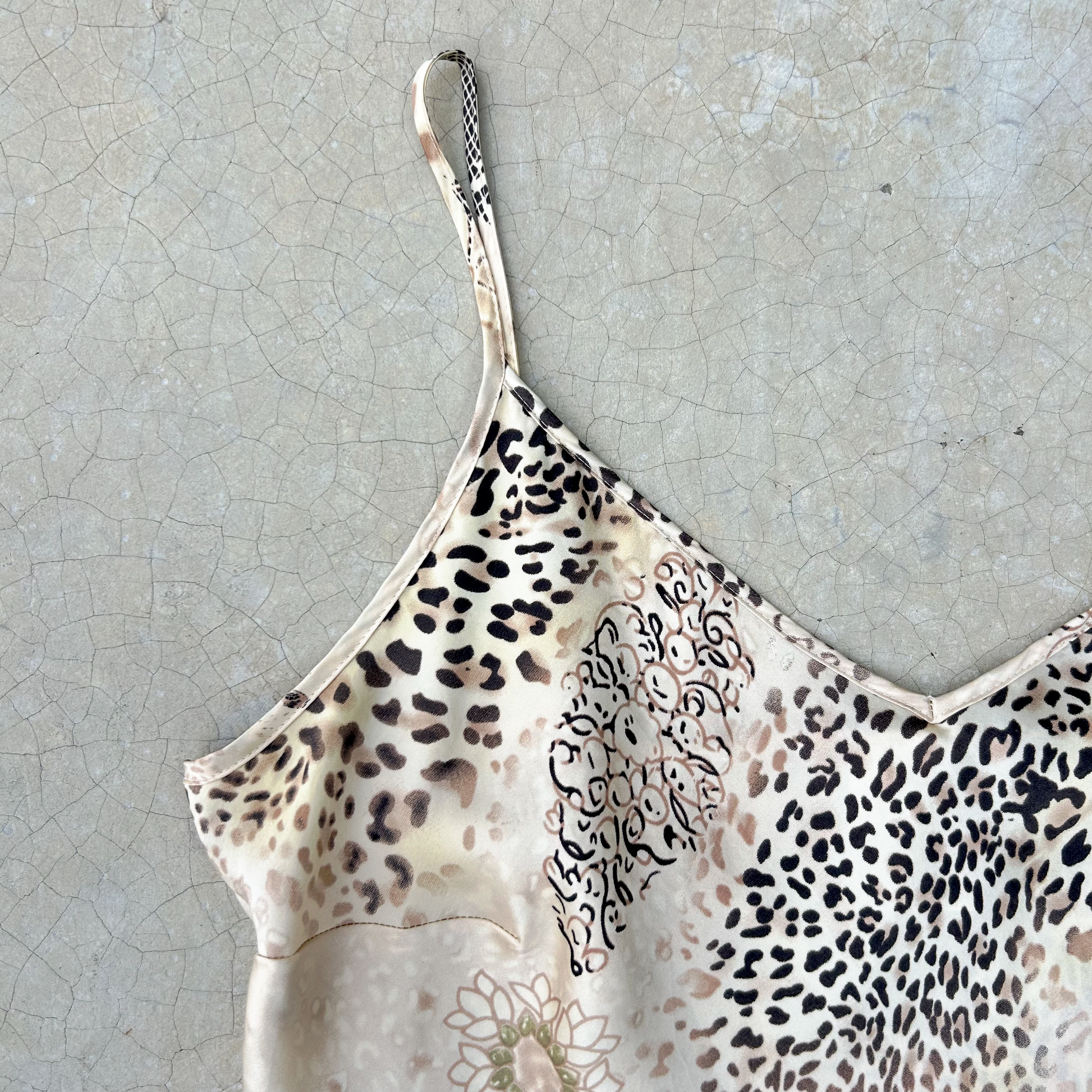 Hermoso top de Charmeuse de seda, estampado de Cheetah mezclado con flores y otros patrones en cafe oscuro, fondo color Champagne y Vainilla, tirantes ajustables, mini aberturas a los costados, muy ligero y elegante.