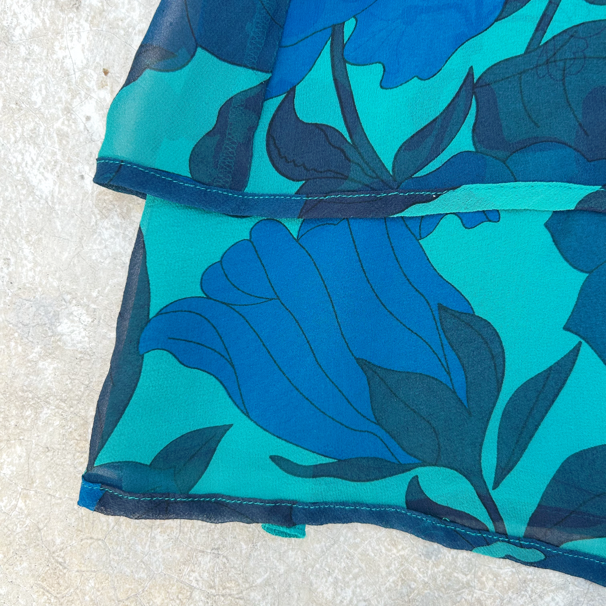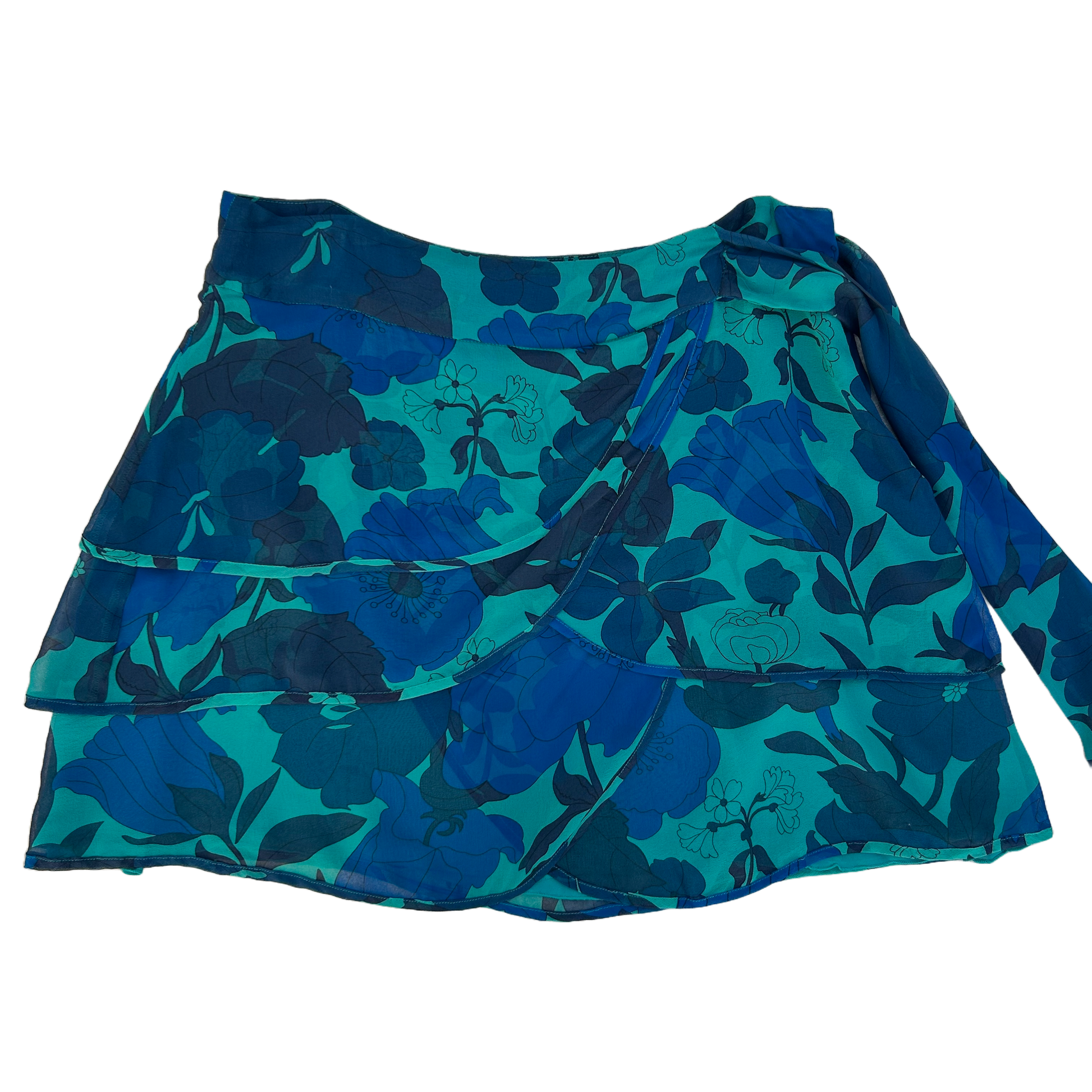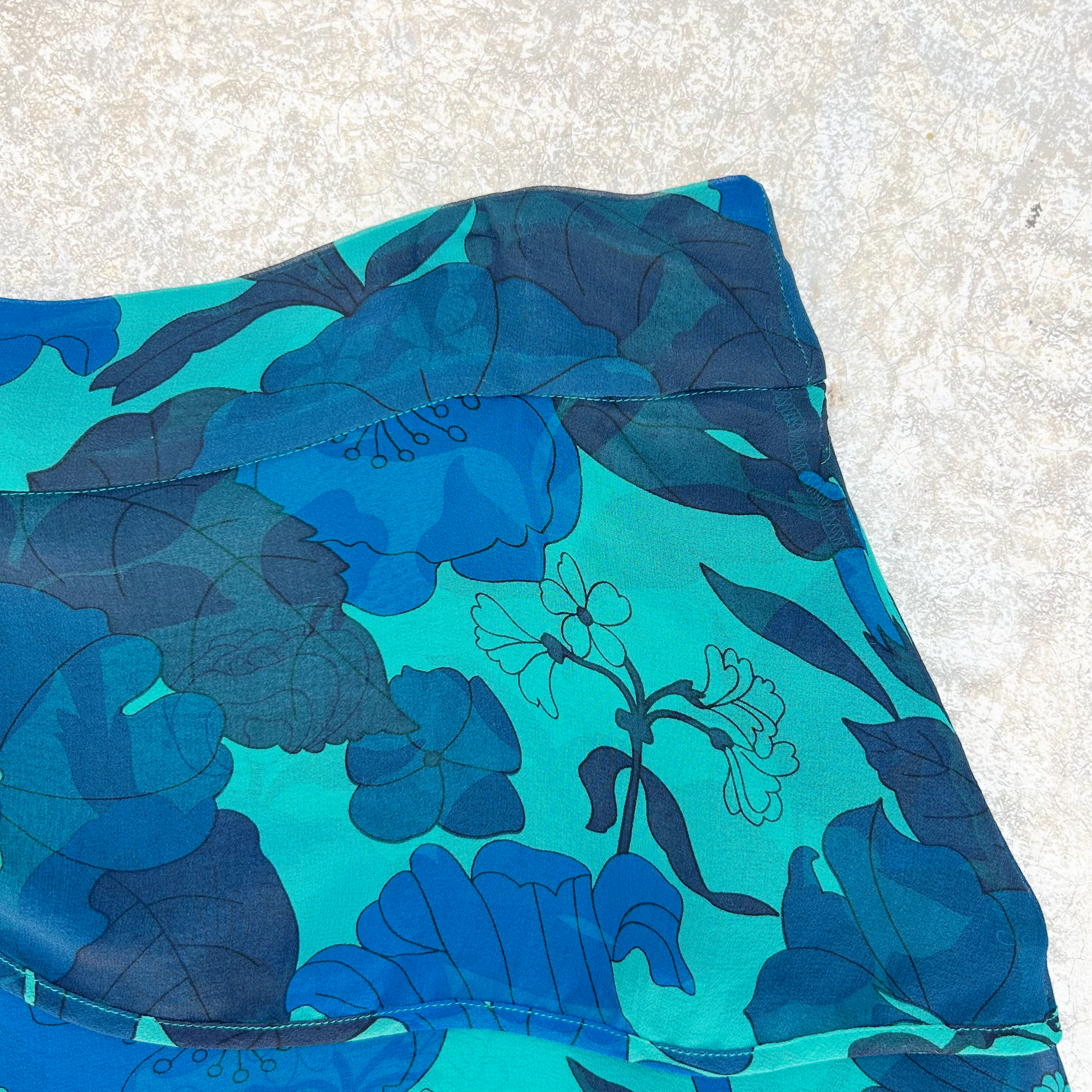 Coquetísima falda de tiempos en organza de seda, exquisita ligeramente transparente, los tiempos son encontrados al frente, tiene forro y pretina junto con dos tiras que permiten hacer un moño lateral, método de acceso cierre invisible, estampado con fondo azul Teal, algunas flores en azul deep y azul deep sea, hermosa!