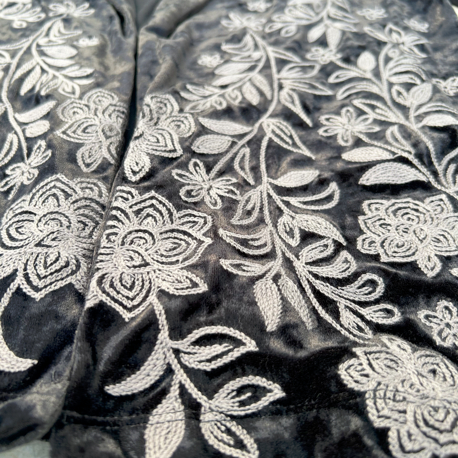 Lindo saco de terciopelo mezcla poliéster y spandex, estampado bordado de flores al frente y mangas en color gris cálido, es ligero con hermosa caída, excelente para elevar cualquier look.