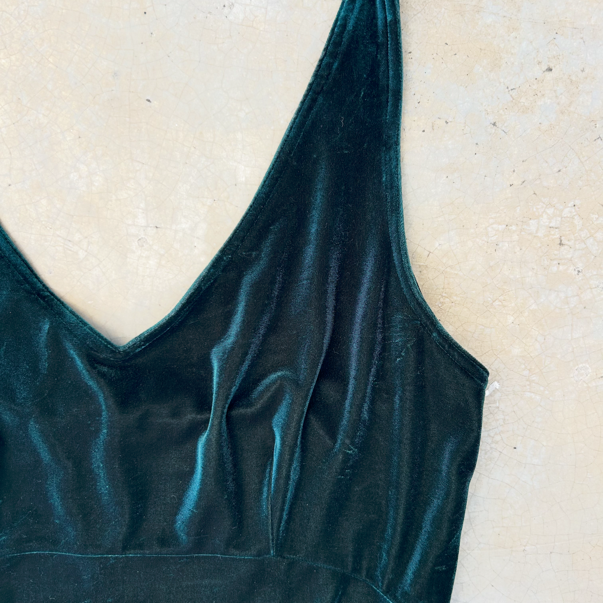 Hermoso vestido de terciopelo mezcla de poliéster y spandex, escote en V, corte imperio con pinzas entallando el busto, silueta en A con cuatro cuchillas en la falda dando mucho movimiento y hermosa caída, lindo color verde petroleo.