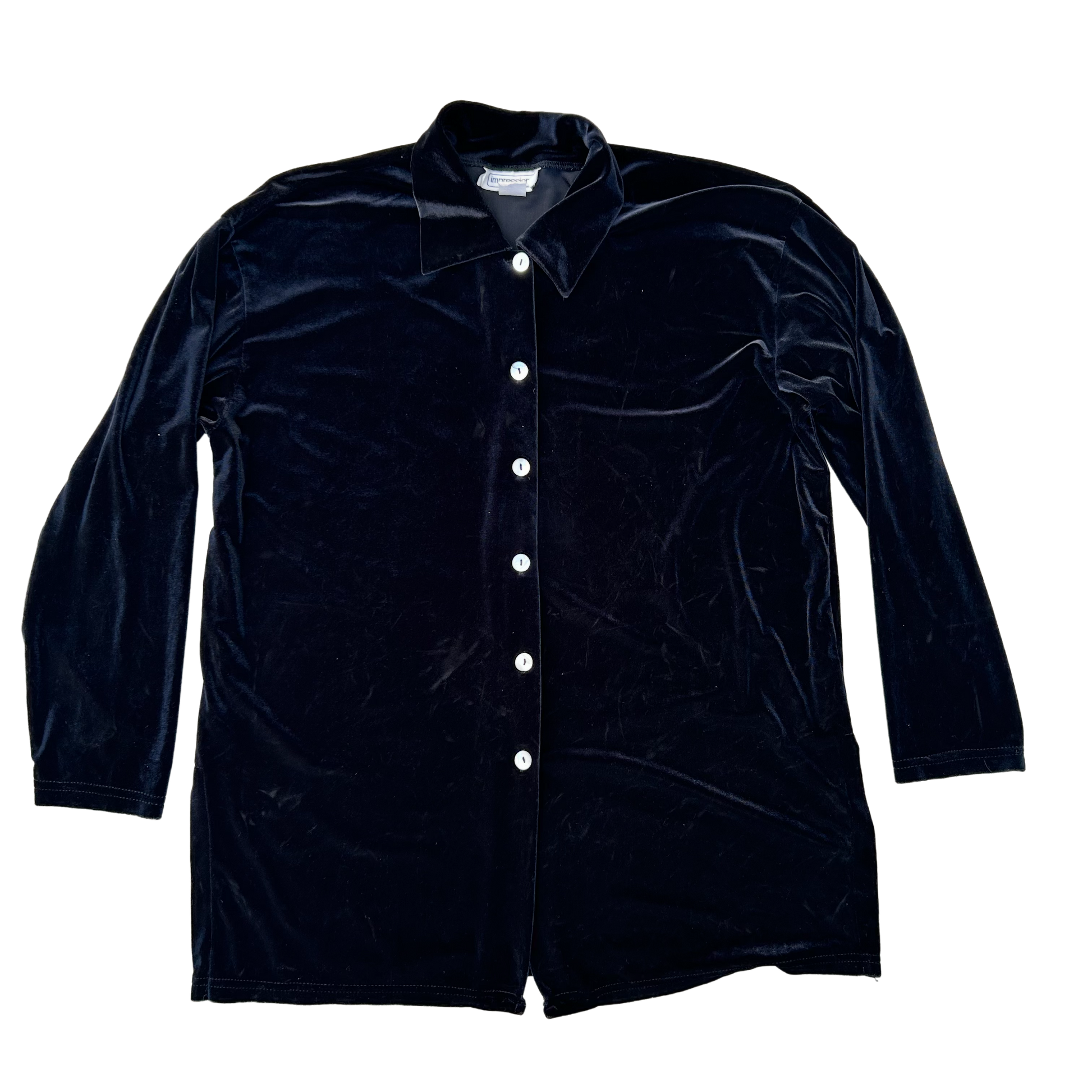 Linda camisa de terciopelo en poliéster, hermosa caida, tiene aberturas medianas a los costados, botones de nacar, el talle es suelto, espacioso.