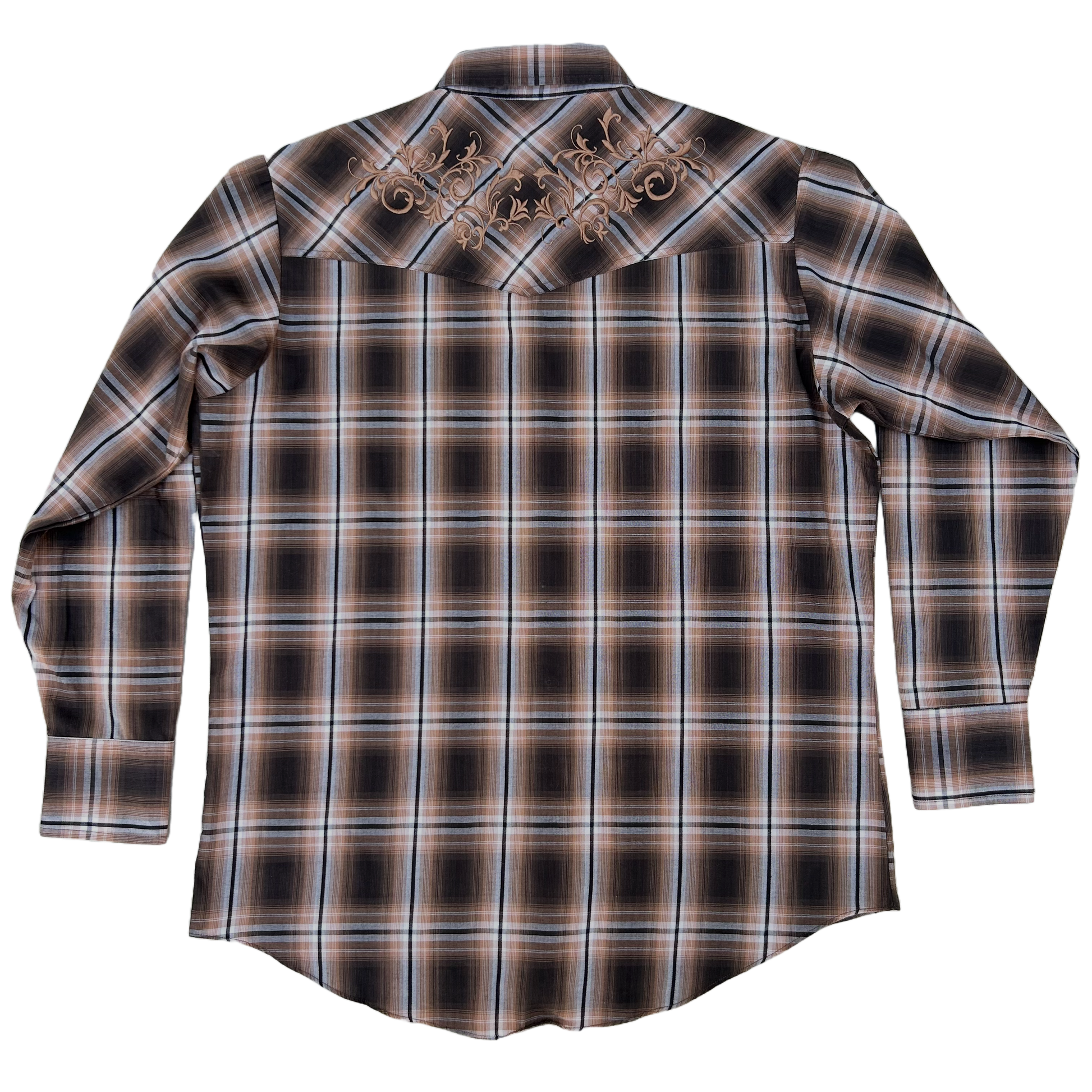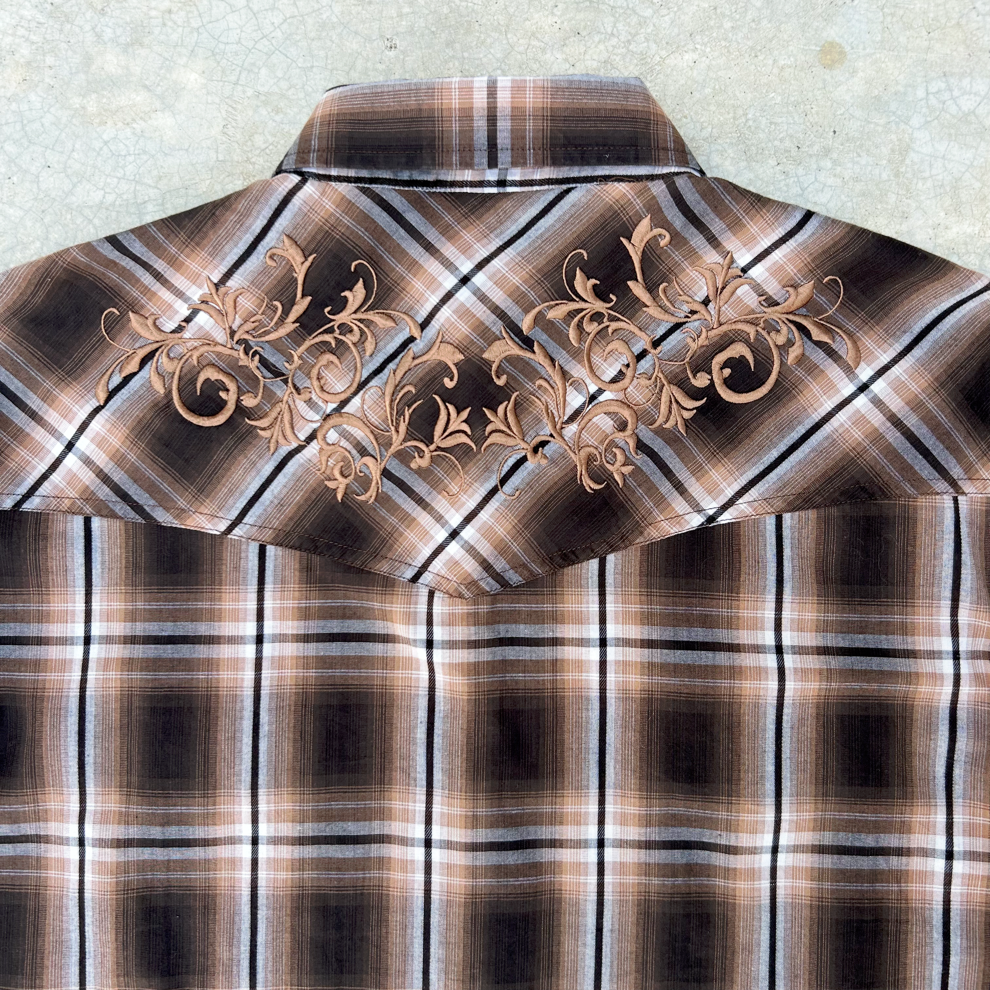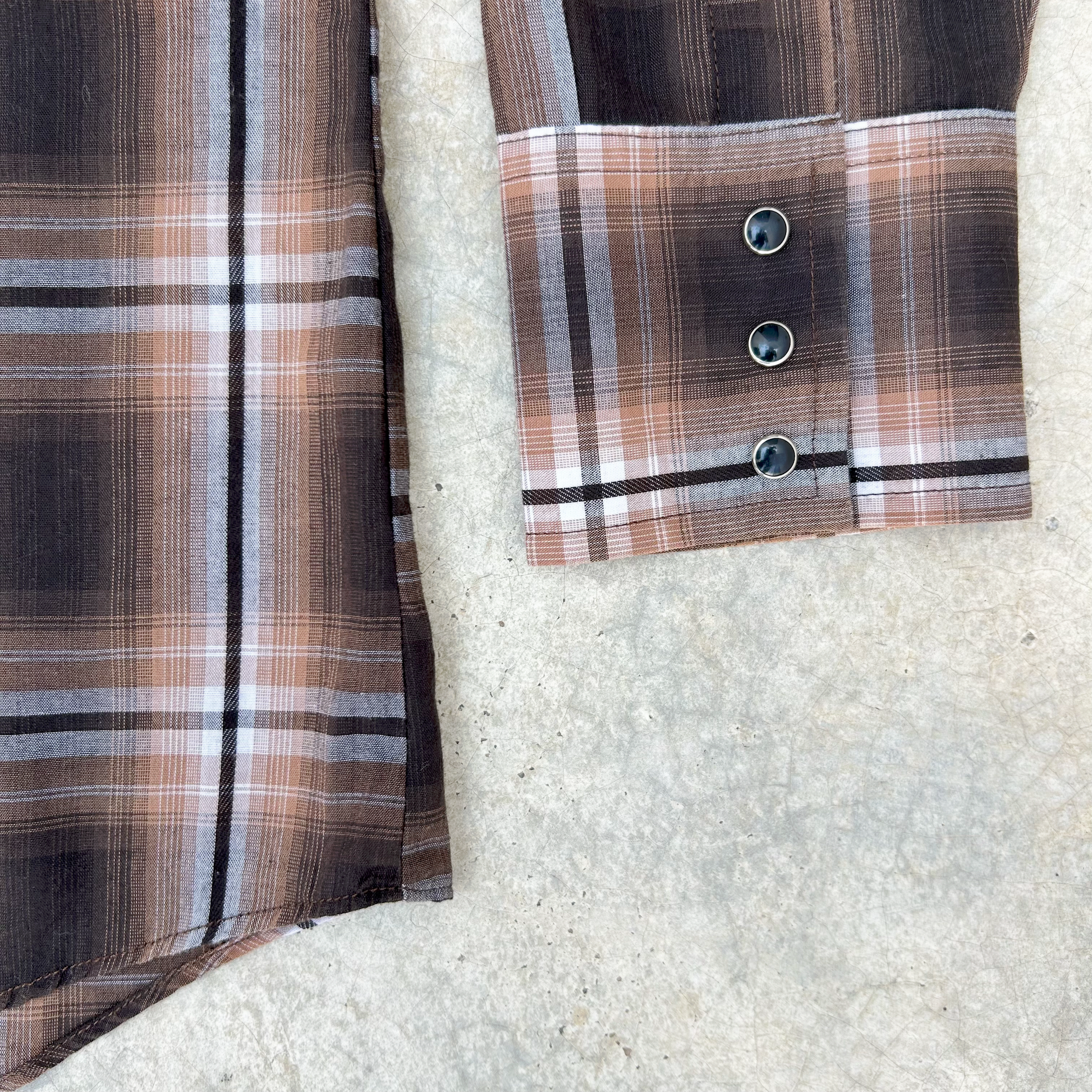 Hermosa camisa de mezcla de algodón, estampado de cuadros difuminados en color cafe oscuro, cafe castaño, pardo y blanco, canesú puntiagudo frente y espalda al bies con bordado en color cafe pardo, doble bolsillo con solapa al bies, broches a presión en color negro.