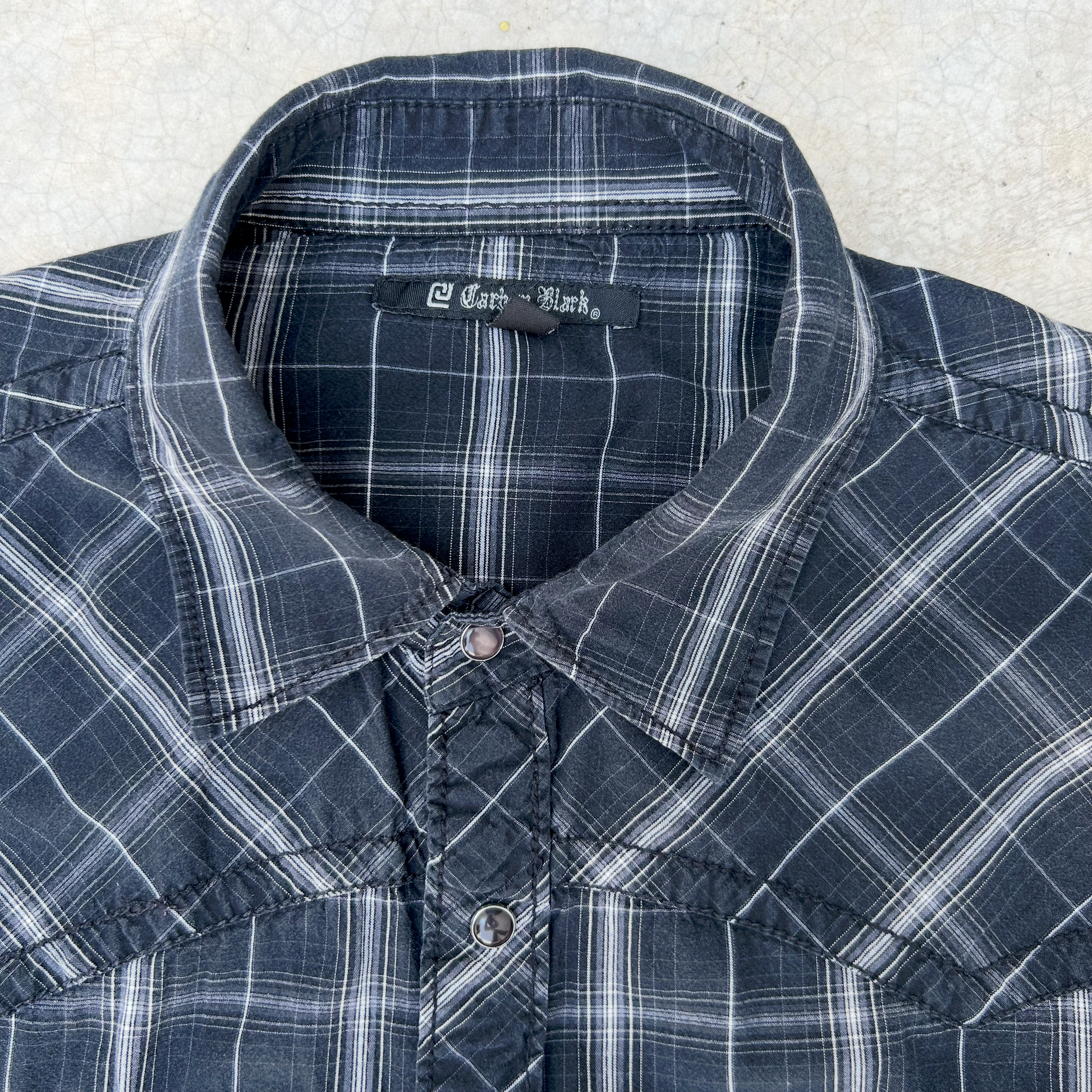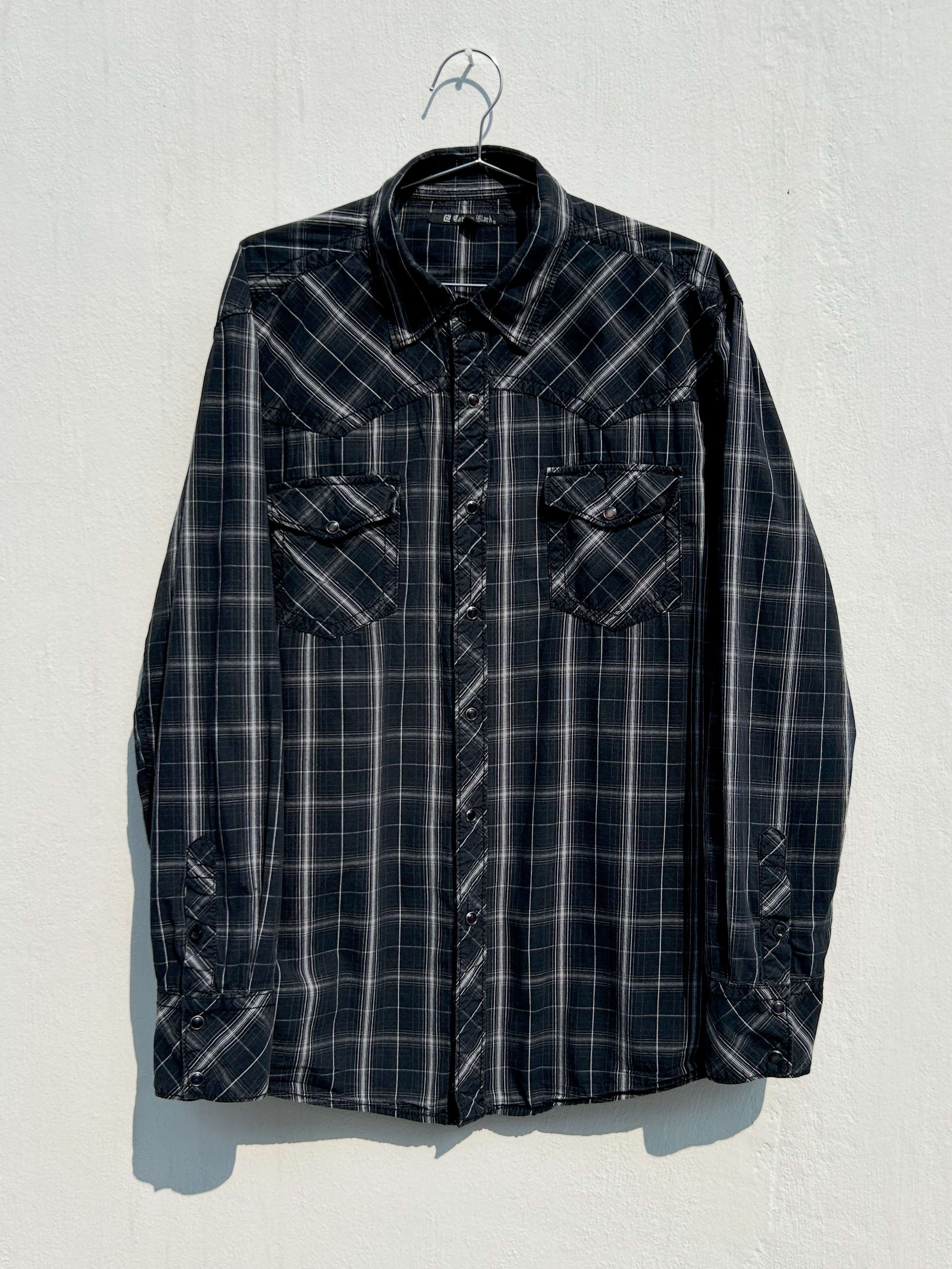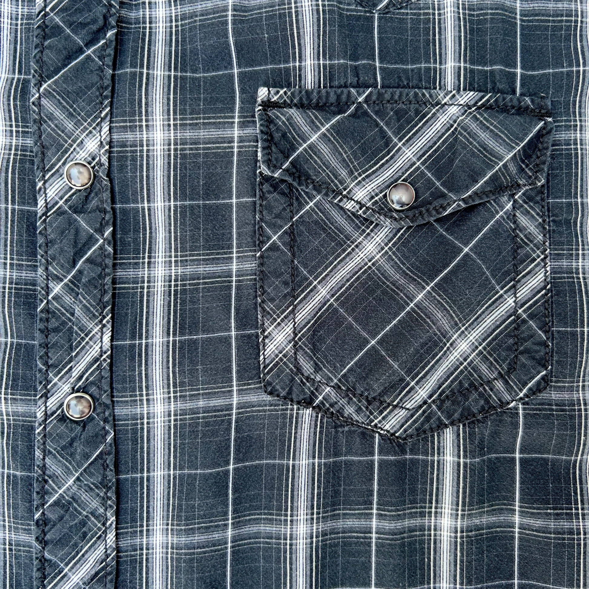 Camisa de algodón, muy suave, clásica, estampado de cuadros con lineas blancas en fondo gris oscuro, canesú puntiagudo frente y espalda al bies, doble bolsillo con solapa al bies, broches a presión en color cafe oscuro.